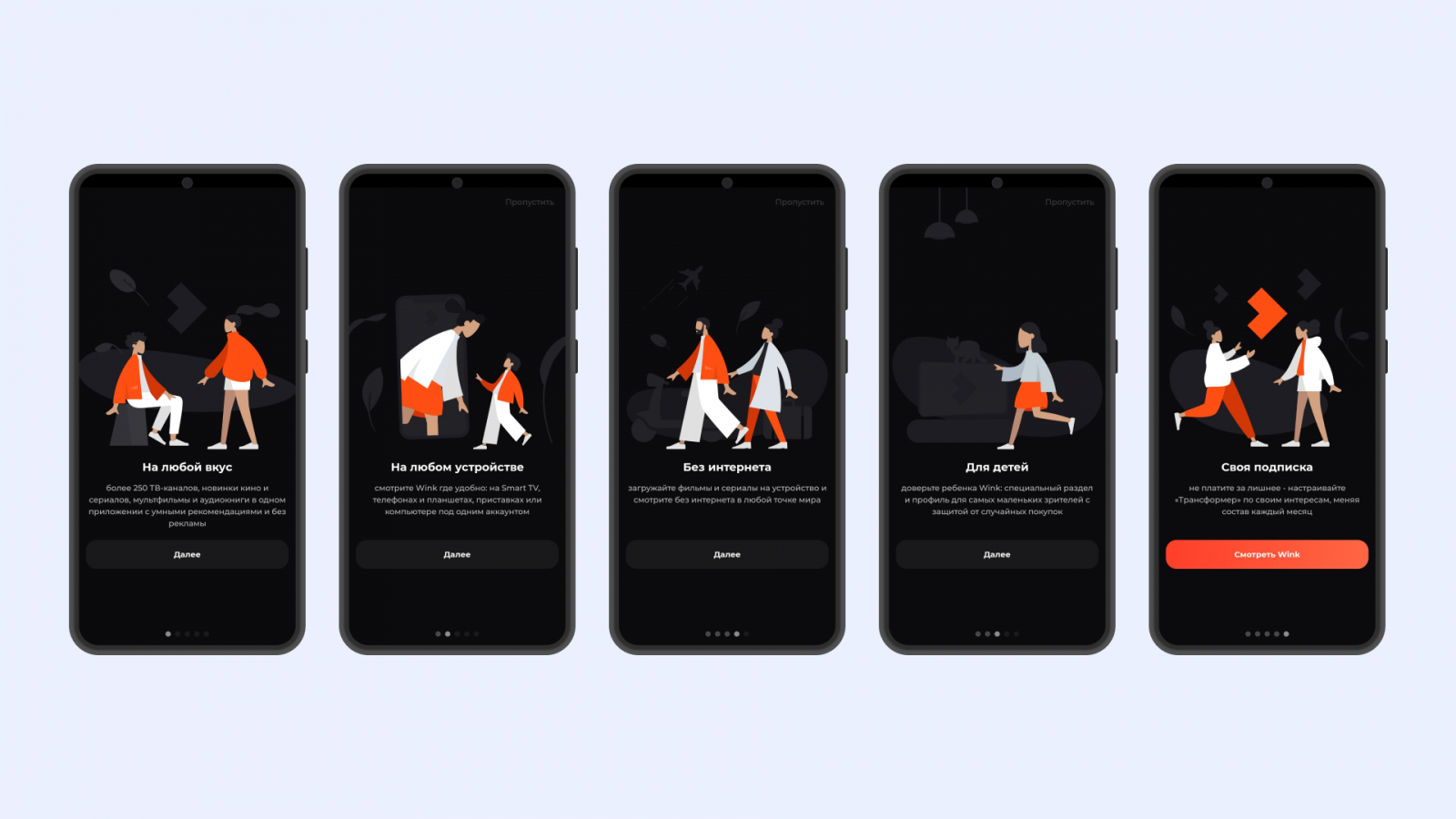 Пример хорошего онбординга мы можем увидеть в приложении Wink: небольшое количество шагов, понятно рассказывается об основных особенностях приложения, есть кнопка «Пропустить», а также имеется индикатор.