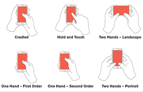 Согласно исследованию Стивена Хубера, люди по-разному держат мобильный телефон, но большинство из них касаются экрана только одним большим пальцем и чаще всего взаимодействуют с центром экрана. Поэтому важную информацию следует размещать по центру.