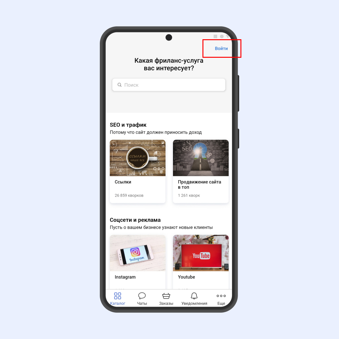 По второму пути, например, пошли разработчики приложения Kwork. Пользоваться им можно без входа в аккаунт или регистрации. Но кнопка «Войти» расположена сверху, поэтому пользователь может в любой момент авторизоваться.