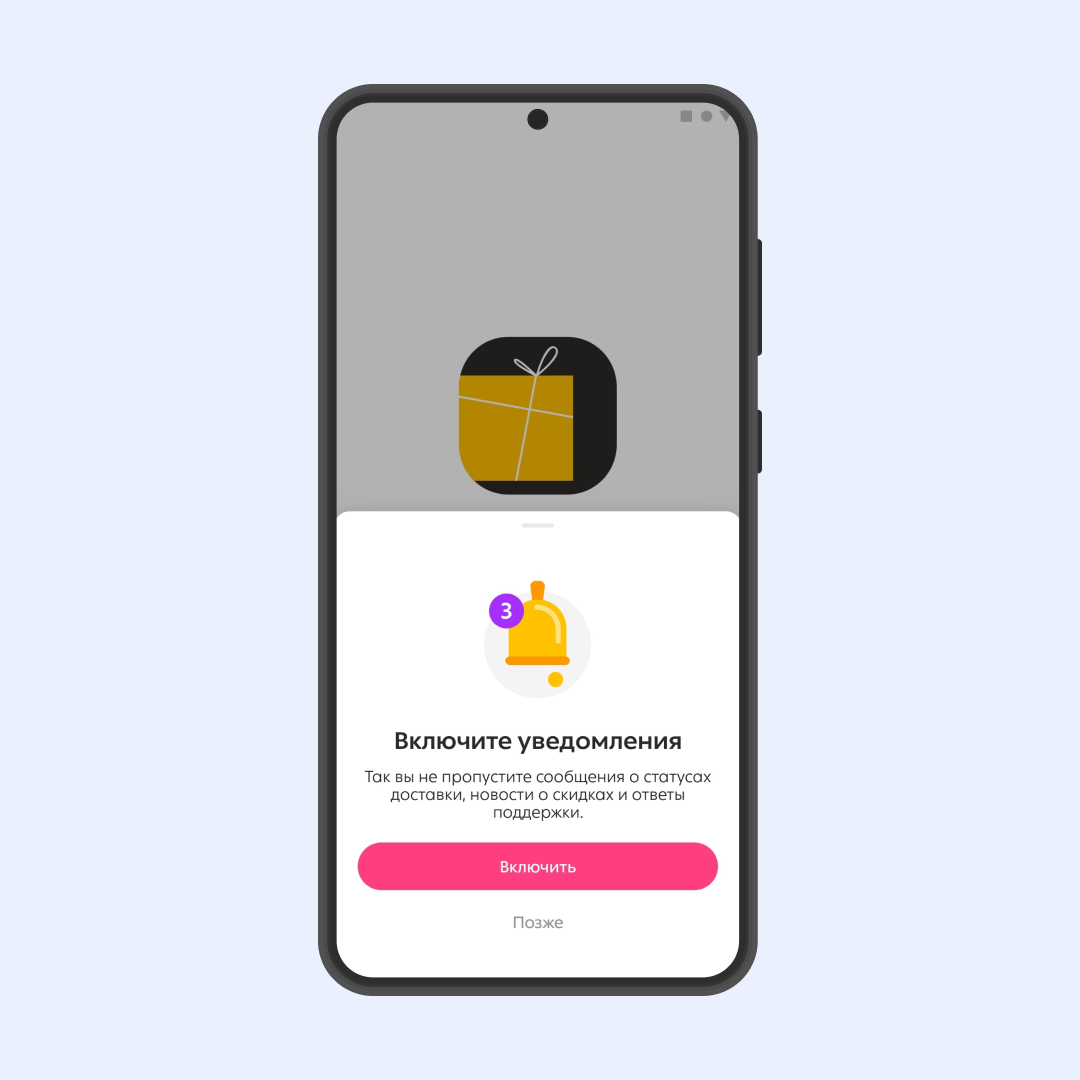 Приложение «Достависта» почти сразу просит пользователей включить уведомления, но делает это грамотно. Во-первых, пользователю дают право выбора — можно нажать на кнопку «Позже» или вовсе закрыть это окно. Во-вторых, приложение объясняет, для чего включать уведомления — сможете отслеживать статус доставки.