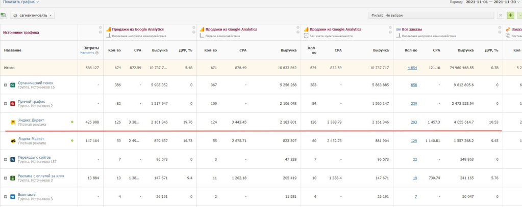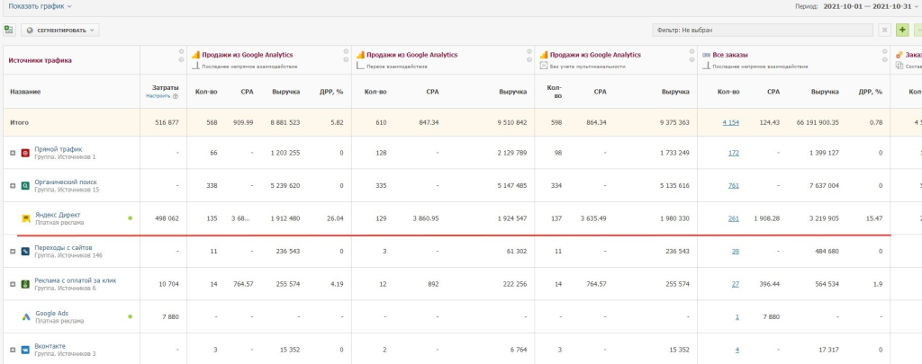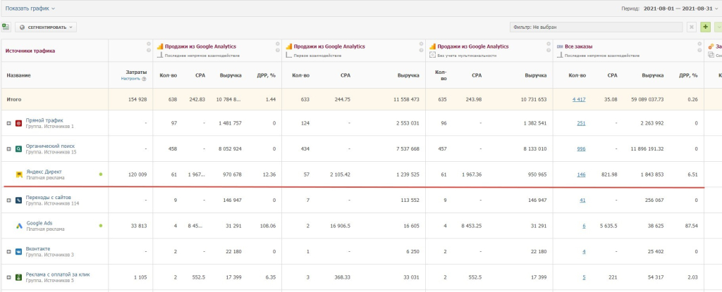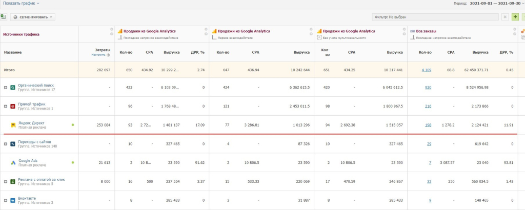 - С заказчиком был установлен предел значения ДРР 20% по верхней границе, соблюдая который реклама приносит прибыль. Для базовых тестов и фиксации результатов был выделен период в два месяца, далее был момент принятия решения о продлении рекламных кампаний. Ниже скриншоты из сквозной аналитики с результатами за август-сентябрь 2021 года.