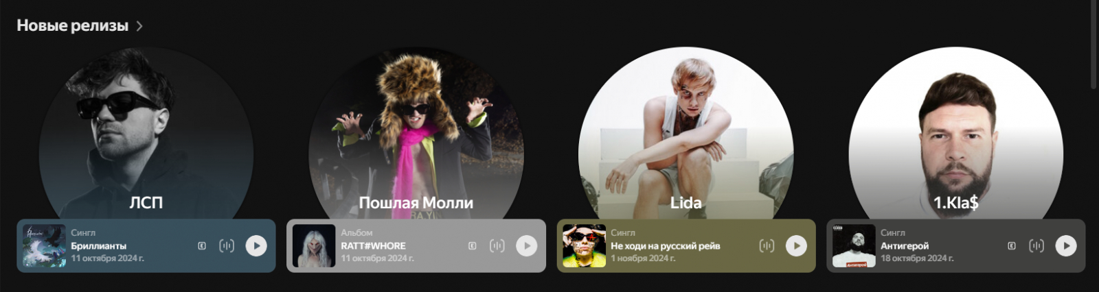 Третий блок на главной — Новые релизы. Они сопровождаются огромной аватаркой исполнителя и мелкой плашкой самой композиции. И тут у пользователей начинается игра «пойми куда кликать»: