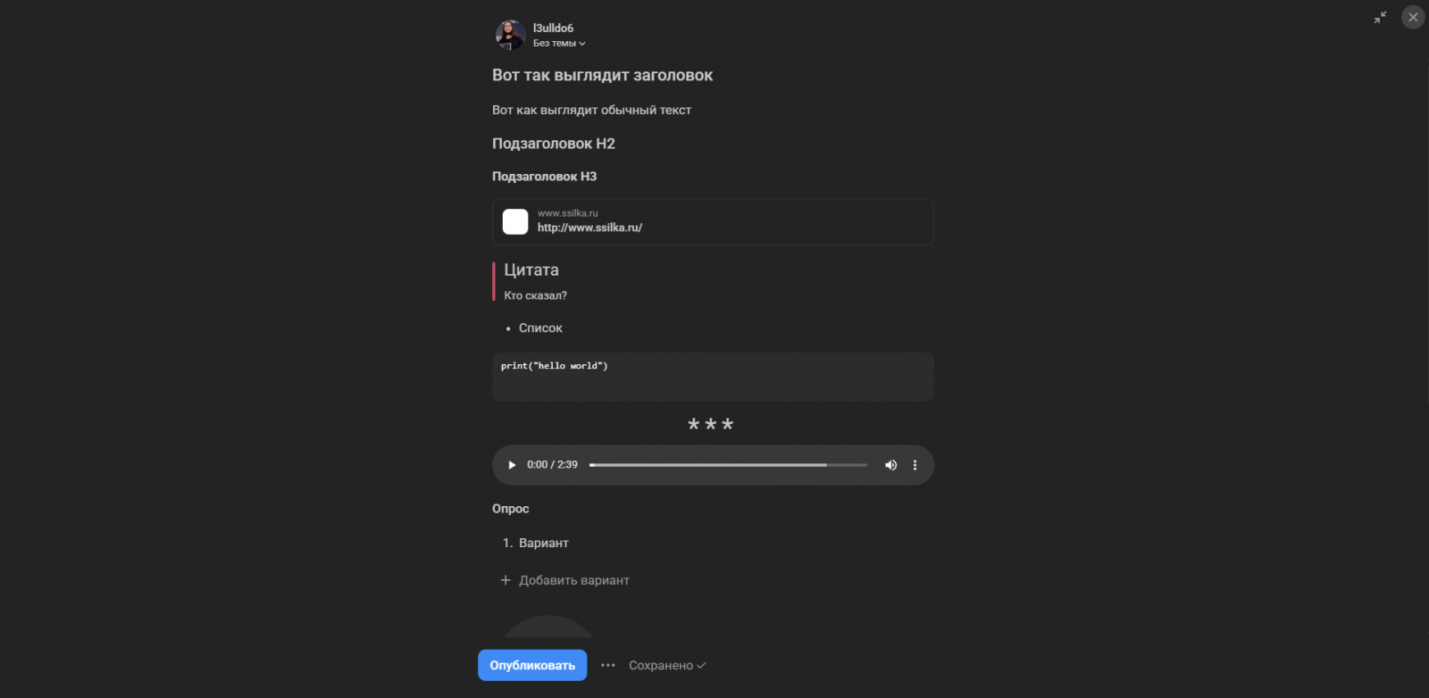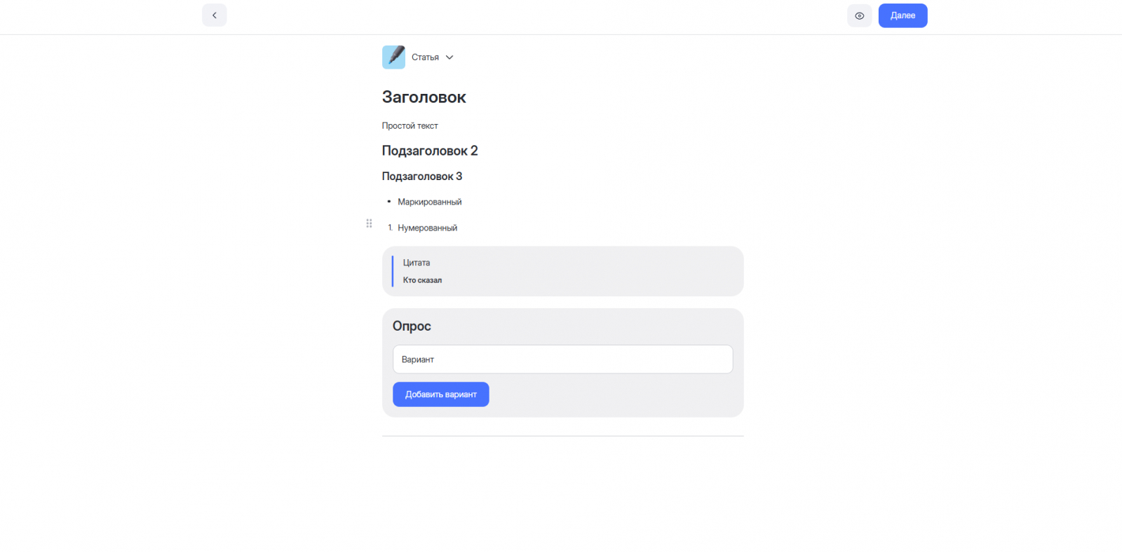 Помимо обычного текста и заголовка здесь есть 12 различных элементов, которые можно добавить в текст. Из интересного: