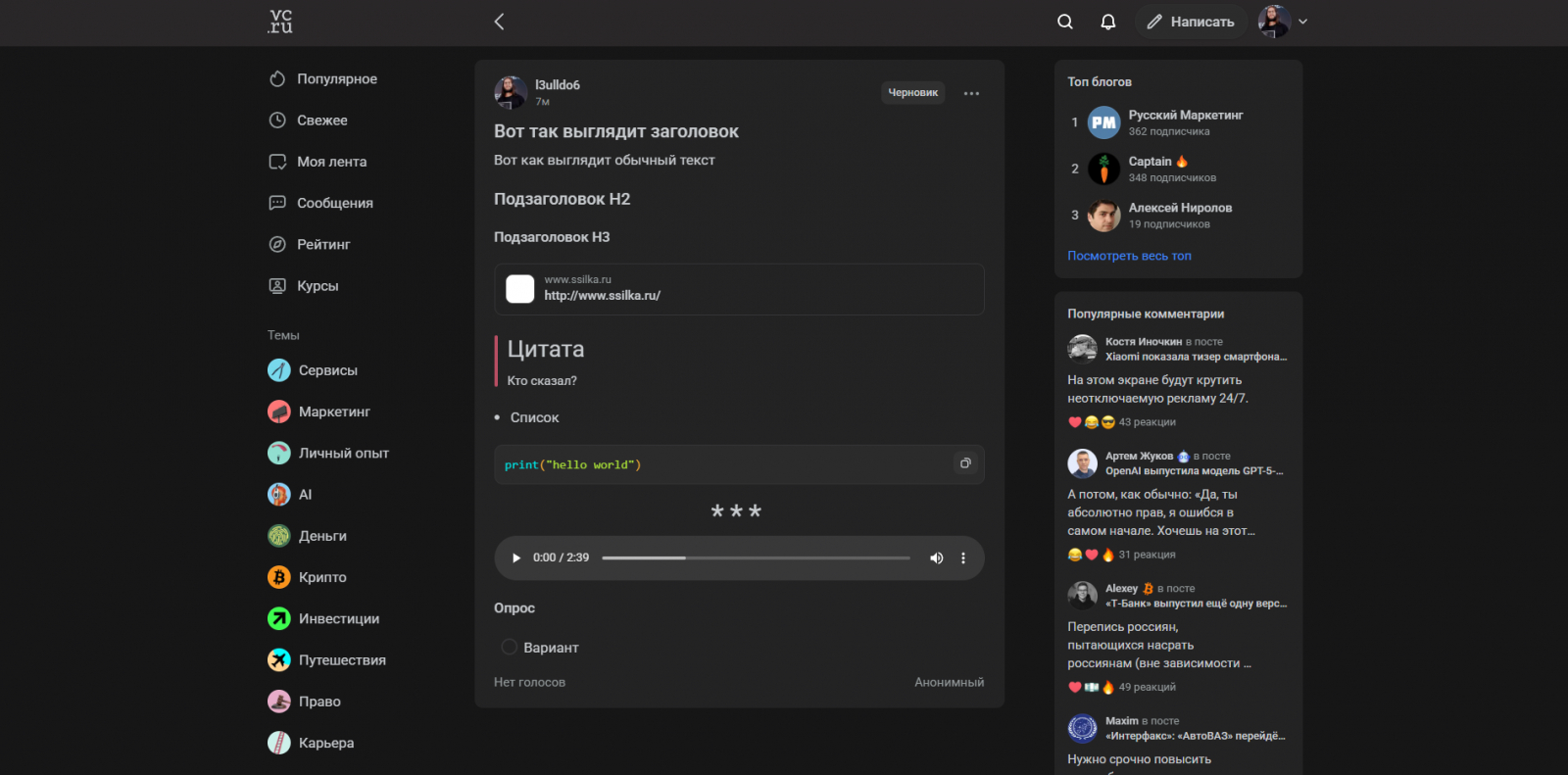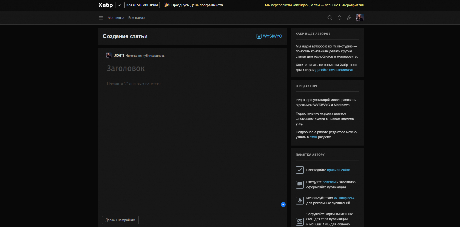 — Я автор, который хочет опубликовать свою статью. Нужно понять, насколько удобен процесс публикации на сервисе, какой инструментарий есть, какие минусы и все, что поможет опубликовать материал.