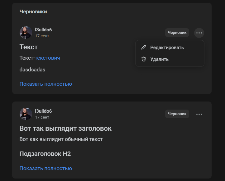 Если вы находитесь на своей странице, то без дополнительных кликов добиться этого невозможно. Раньше именно здесь располагался раздел «Черновики», сейчас же от него отказались. Сделали чуть менее удобно и интуитивно непонятно.