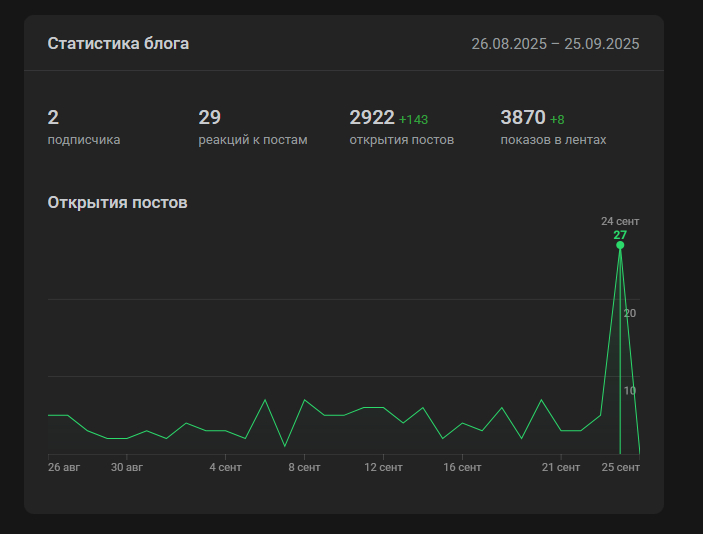 Кроме того, график отражает лишь «зеленые цифры» в статистике. Несмотря на выделение отдельным цветом это может смутить автора. Ведь кажется, что блог за месяц собрал почти 3к открытия открытий. Но нет, эти цифры были собраны за все время существования блога.
