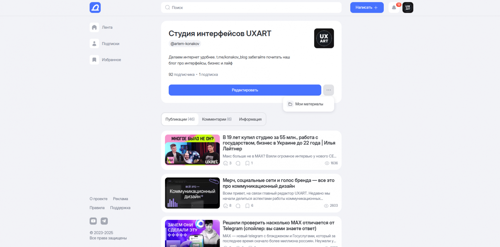Зато из плюсов можно выделить переход на все материалы со страницы автора. Нужно кликнуть на три точки и перейти в «мои материалы»: