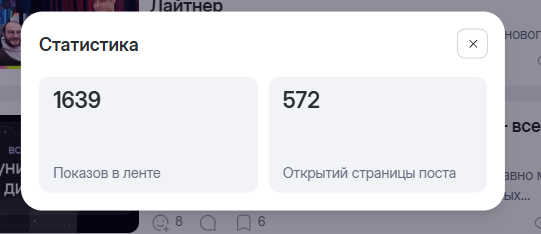 Из минусов — на этом экране мы видим цифры с момента публикации. Из плюсов, хоть и странных, мы видим репосты в ВК и ФБ.