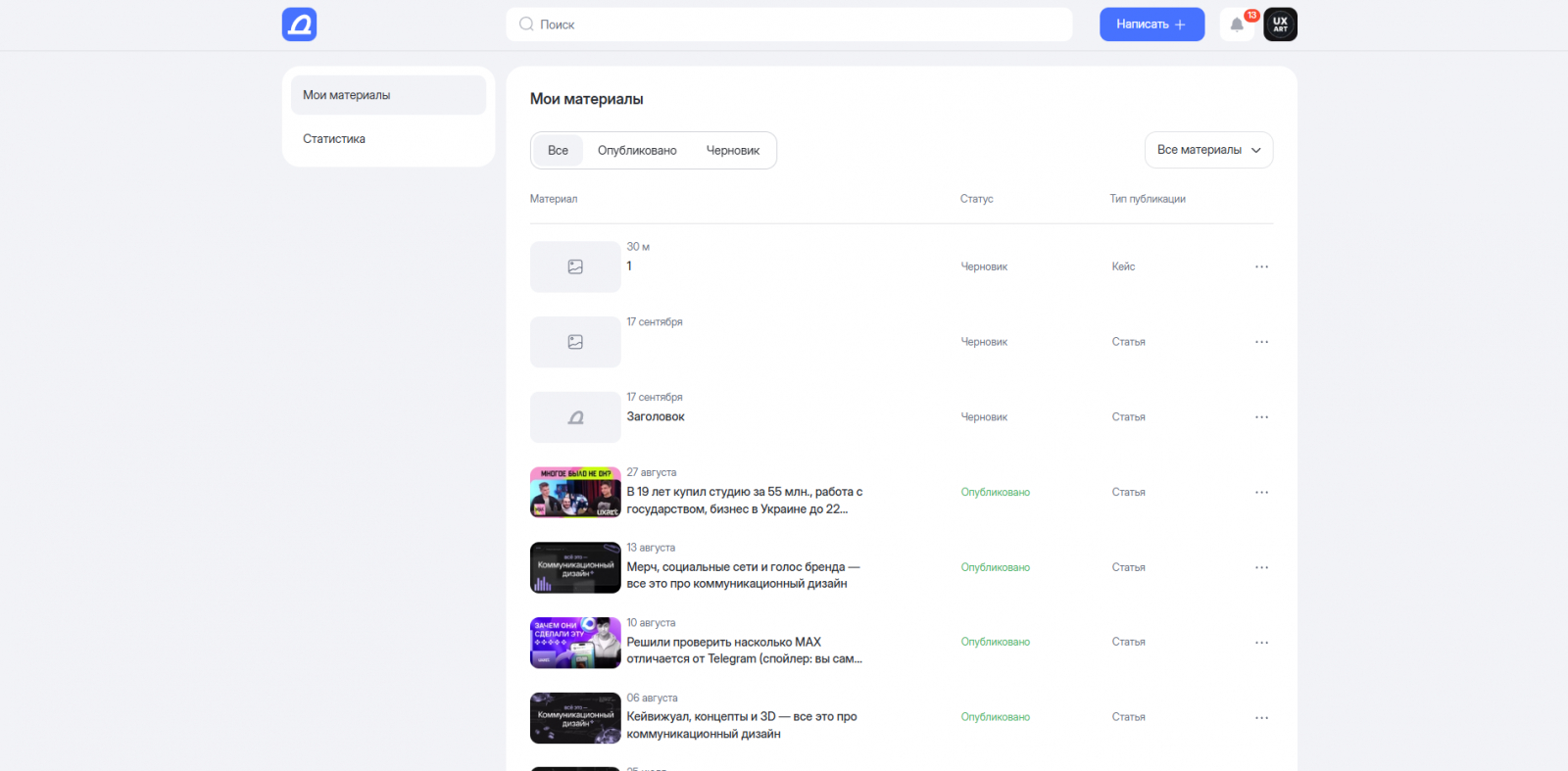 Да, глаза вас не обманывают. Здесь нет перехода в ваши материалы. Вместо этого, черновики располагаются в разделе «Статьи» на вашей странице.