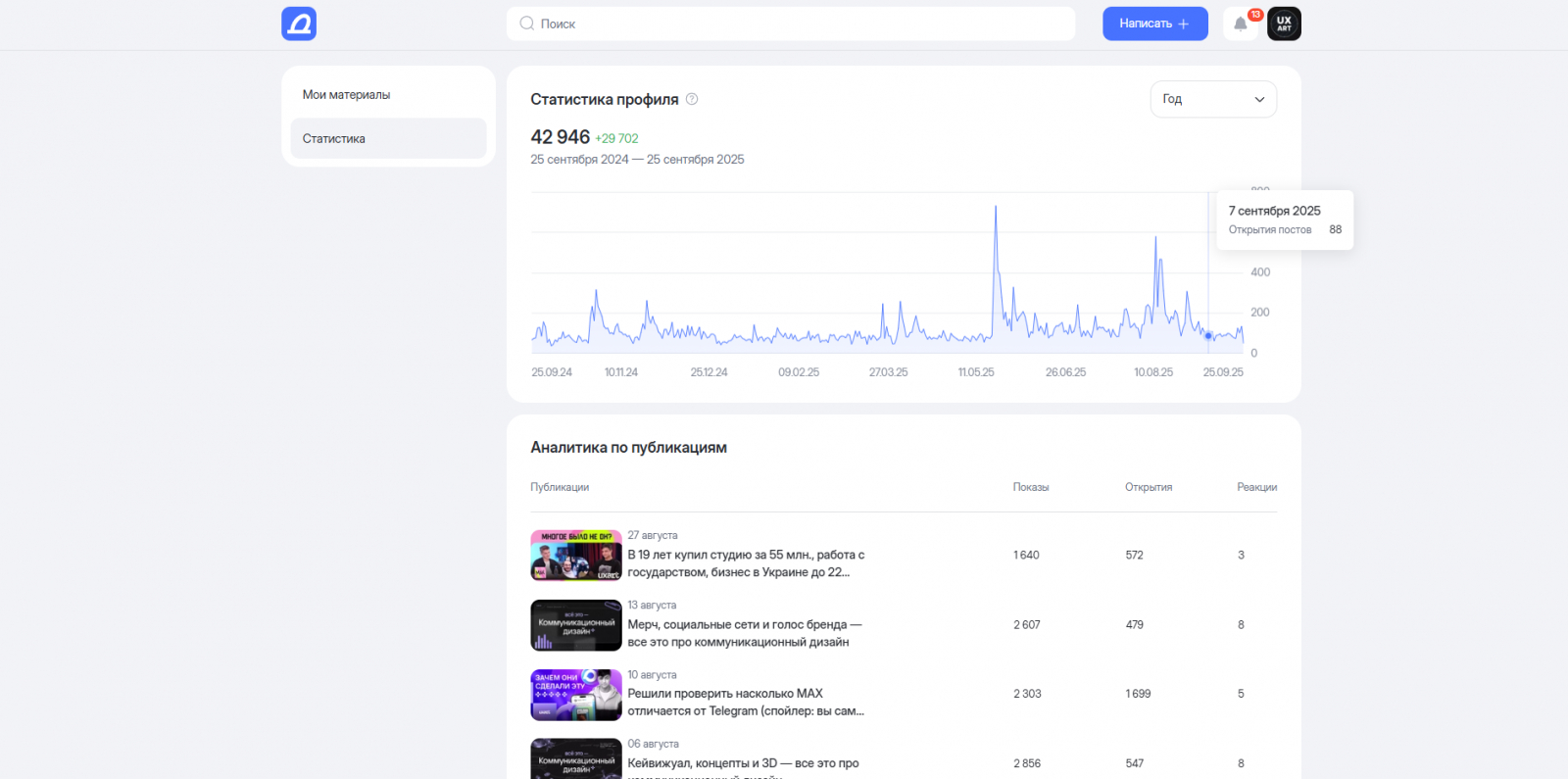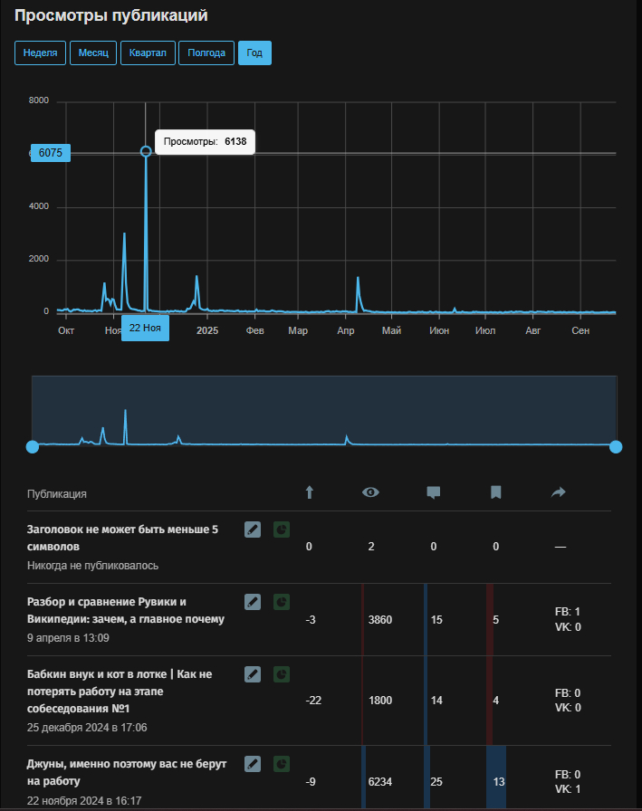 Общая статистика похожа на ту, что мы видели на Dsgners. Самостоятельно нам разрешают выбрать временной промежуток, который отражает лишь «просмотры» статей. Изменить метрику мы не можем. Зато снизу можем увидеть статистику по конкретному материалу.