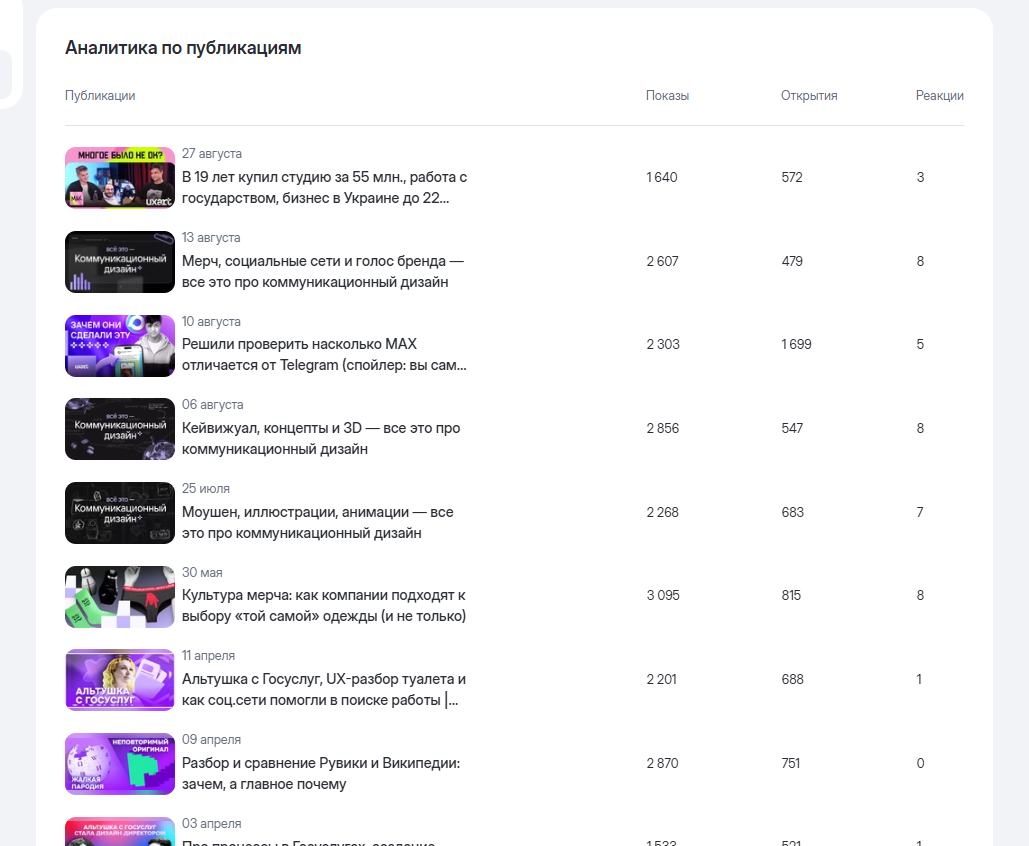 НО, ниже вы можете отслеживать статистику по отдельным статьям в 3 критериях — «показы», «открытия», «реакции». Почему это нельзя было вывести на график — вопрос интересный. Но за возможность — плюс.