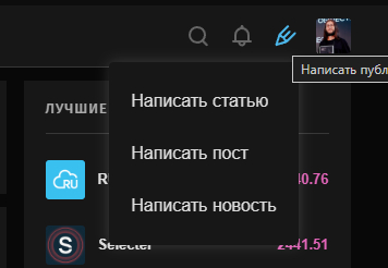 На Хабре кнопки «Написать» нет. Вместо неё маленький карандаш, который расположен рядом с вашей аватаркой. И при клике на него вам предлагается выбор из 3 типов материала: