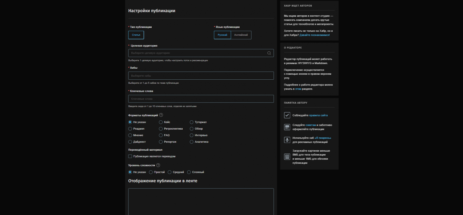 В отличие от других площадок, заполнение этой инфы строго обязательно. Также стоит учитывать, что модерация четко следит за вашим выбором. И если вы обманули пользователей, то статья отлетит в бан. Ну и сами пользователи успеют накидать минусов)