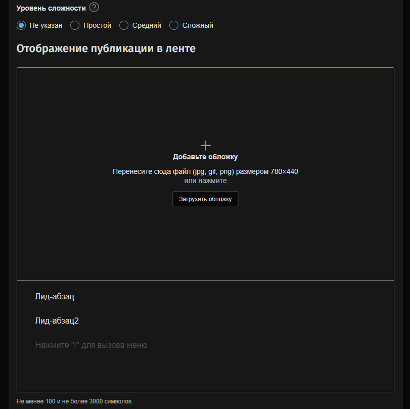 Отображение настраивается отдельно от самой статьи. Здесь вы можете загрузить любую обложку (совет, не стоит сильно байтить, аудитория такое не любит) и настроить отдельный лид-абзац.