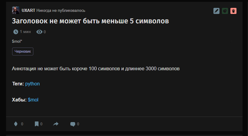 Также редактор не позволит вам закинуть в черновик материал, не проходящий базовый минимум по символам. Не могу выделить это ни в плюс, ни в минус. Но сказать об этом стоит.