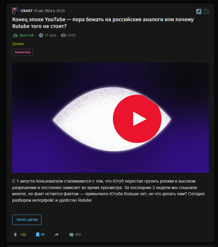И сразу еще один плюс, но уже со стороны пользователя. На карточке также располагается «приблизительное время прочтения» материала. Впервые увидел эту функцию именно тут и хочу поблагодарить создателей за неё. Часто это помогает понять, стоит ли тратить на материал время.
