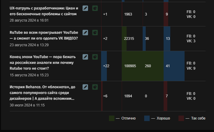 А вот из интересного, Habr подсвечивает показатели тремя цветами, которые отвечают за результат вашего материала. Не до конца понятно по какому принципу он высчитывается — по вашей личной стате или по общей, но сама концепция хороша: