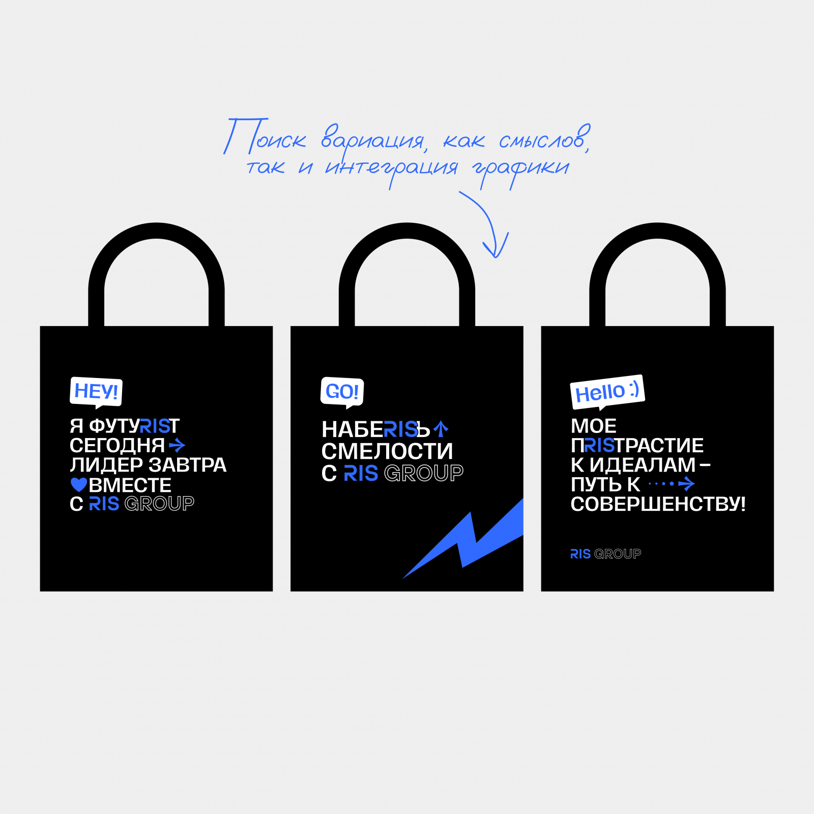 У нас модульный фирменный стиль, позволяющий достаточно свободно взаимодействовать с логотипом и его элементами, для нас эта задача была на 100% творческой – как с точки зрения дизайна, так и с точки зрения внутреннего согласования с коллегами из HR-отдела и фаундерами RIS group.