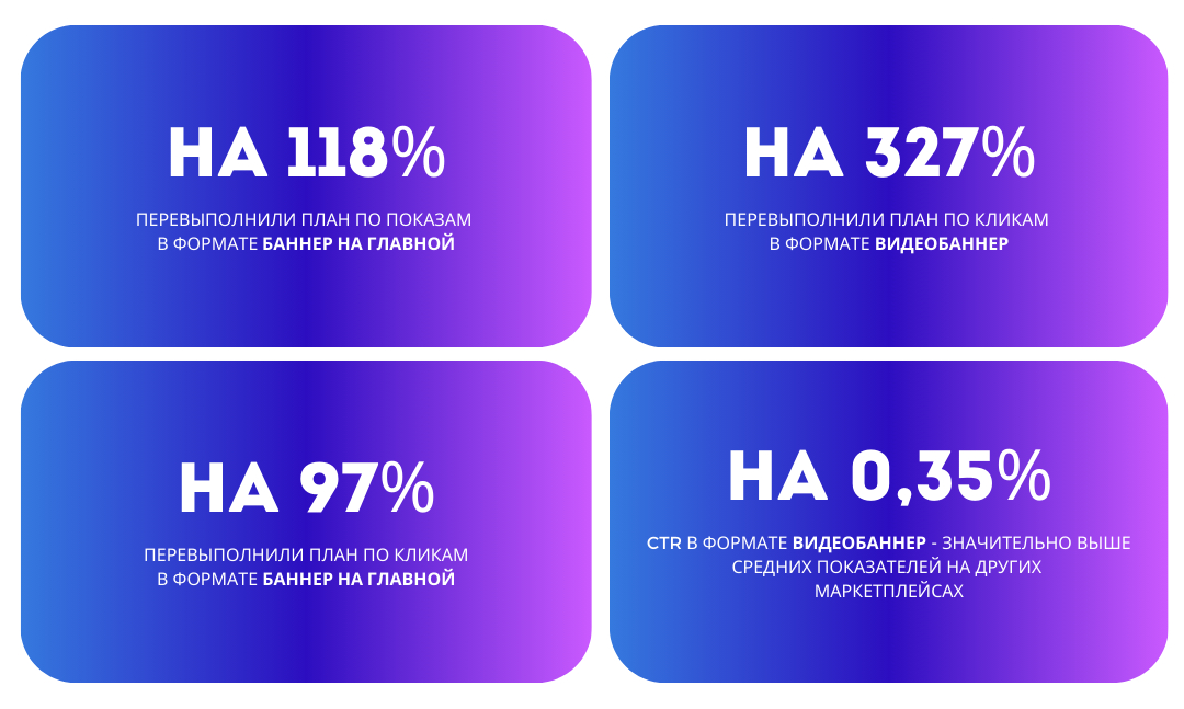Всего было запущено 8 рекламных кампаний с разделением на баннер на главной и видеобаннеры. На каждый из форматов приходилось по 4 сегмента: детские товары, автотовары, товары для красоты и электроника.