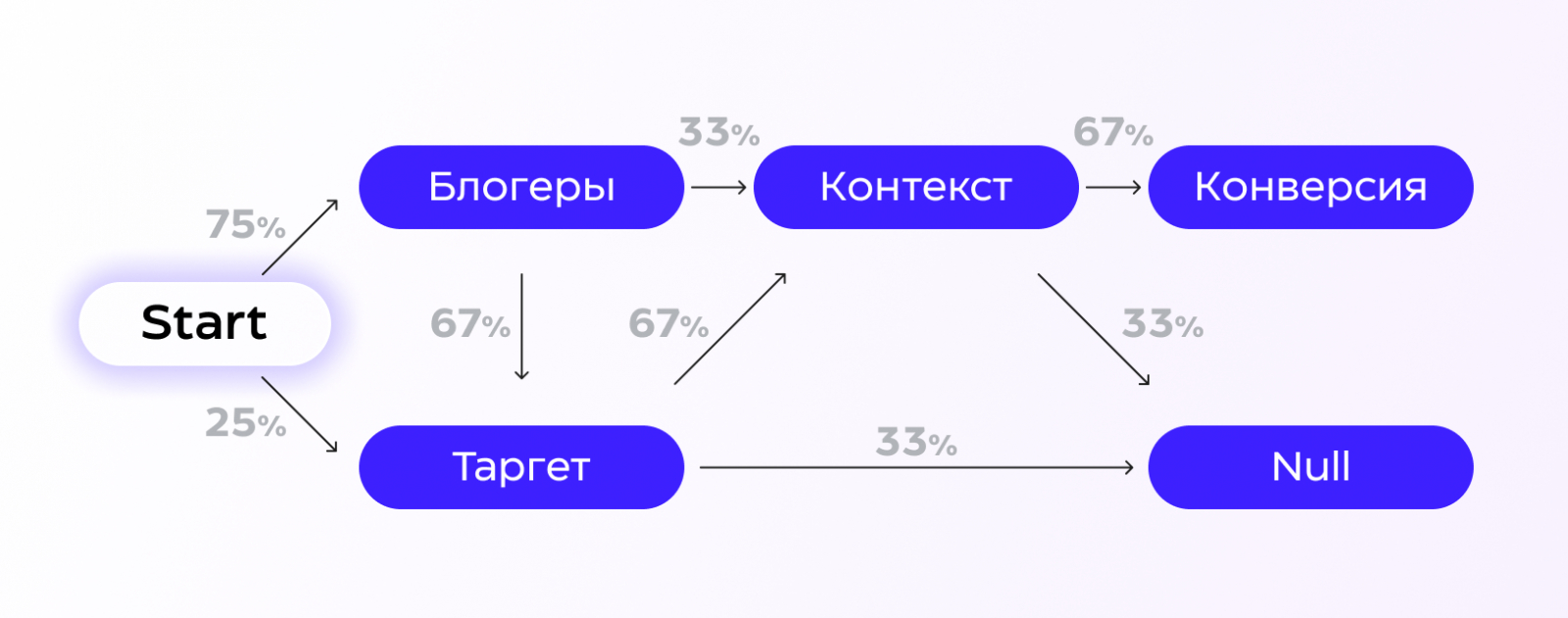 Removal effect рассчитывается на базе вероятностей — вероятности перехода на определенный канал и вероятности конверсии по каждому пути. Для проведения исследования мы используем данные трекинговой системы: при запуске медийной рекламы каждая рекламная кампания каждого канала и площадки отмечается пикселем, который отслеживает все действия пользователя — когда он увидел объявление или кликнул на него. Благодаря этим сырым данным мы можем выстроить цепочку или путь пользователя до конверсии.