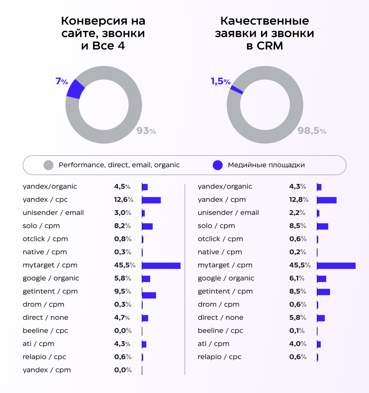 Мы запустили медийные каналы таргетированной рекламы, аукционной рекламы и fullservice площадки. По итогам запуска мы провели исследование Removal effect, чтобы оценить вклад каналов в конверсии на двух уровнях воронки: взаимодействие с номером телефона/формой на сайте и качественные заявки и звонки в CRM.