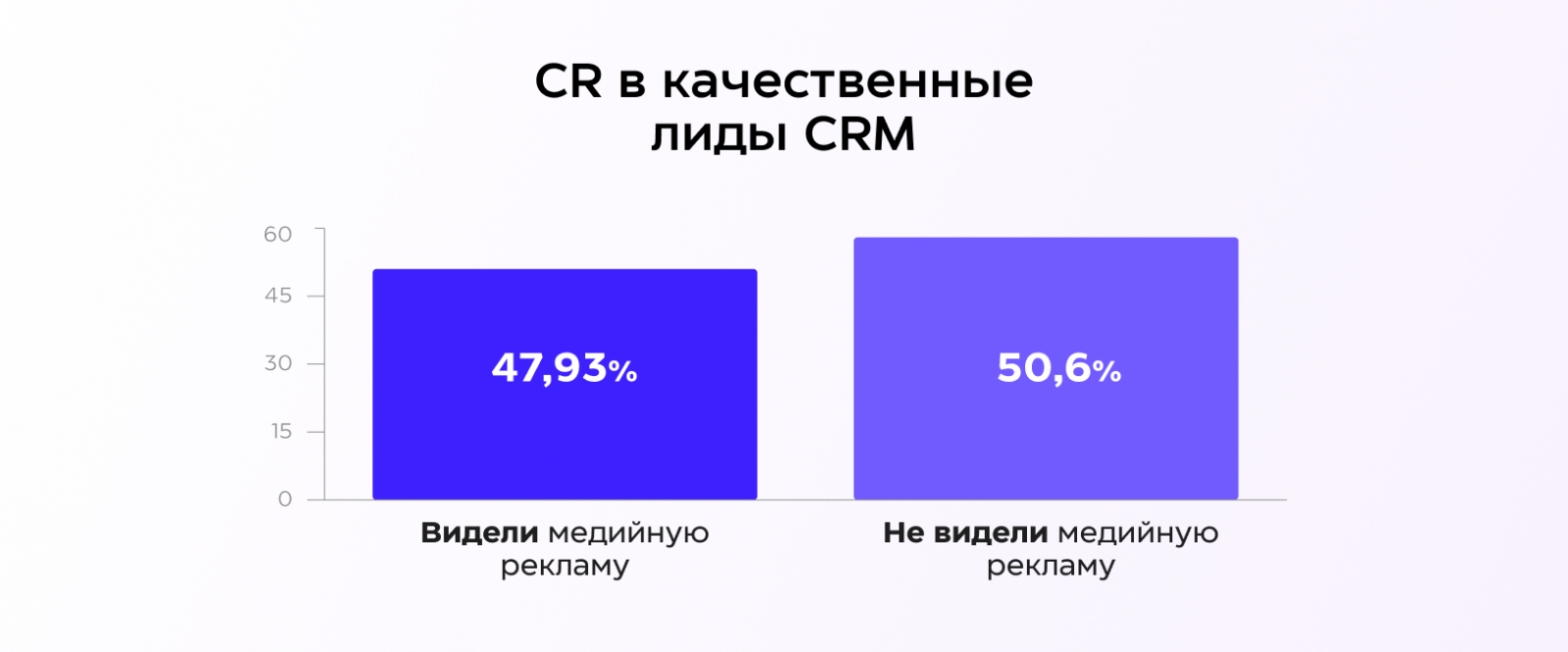По итогам первого флайта мы не увидели значительного прироста CR среди видевших рекламу, однако выявили, что прямые конверсии являются доминирующим источником конверсий на самом нижнем уровне воронки — CRM, обеспечивая 47% всех CRM-лидов.