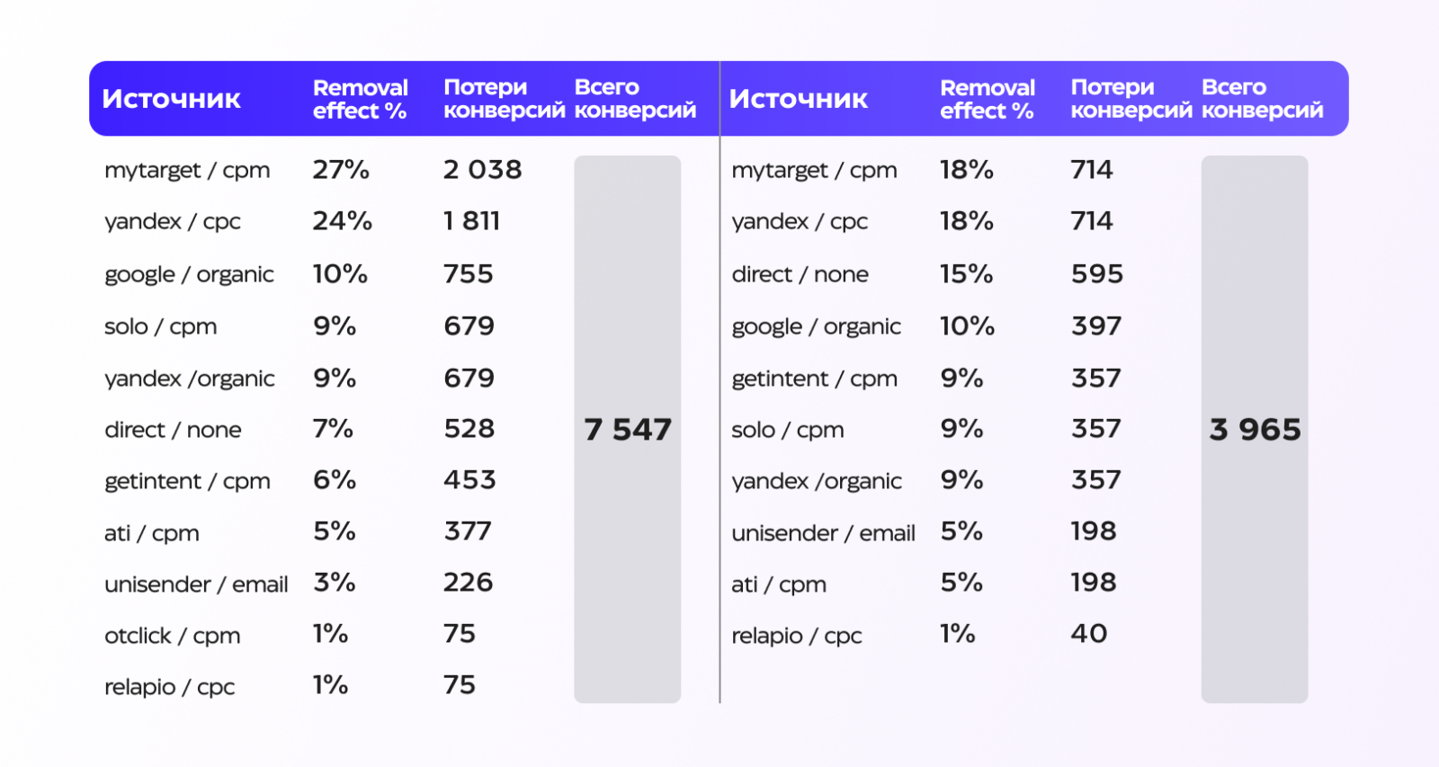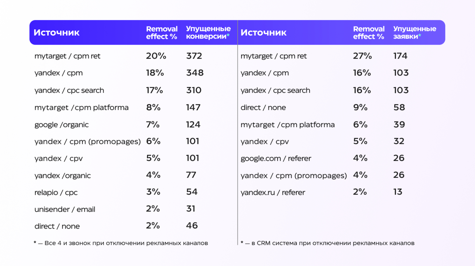 Аналогичный подход мы использовали, чтобы оценить значимость каждого канала в пути пользователя до конверсии. Мы увидели, что при удалении взаимодействия с размещениями MyTarget 27% заявок будут потеряны, а при удалении Yandex RTB — 16% или 277 качественных CRM заявок суммарно.