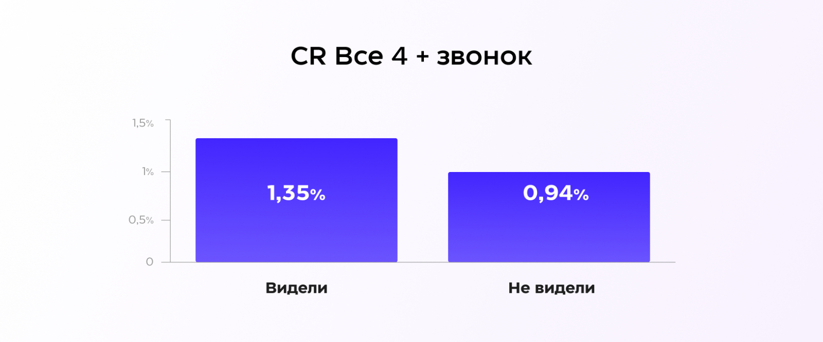 Методом сравнения показателей CR мы можем определить влияние медийной рекламы в цепочке до конверсии. С момента старта медийного флайта наблюдаем положительный CR-лифт по целям отправки формы с сайта и звонки. Так, мы можем сделать вывод, что запуск медийной рекламы позволил увеличить CR на 44 для отправки форм и звонков на сайте.