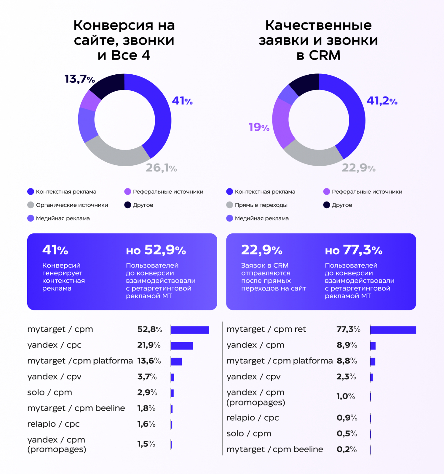 Из медийных площадок MyTarget обеспечил более эффективное влияние на пост-кликовые конверсии. Removal effect канала составил 27% для конверсий на сайте и 18% для качественных заявок и звонков в CRM. Другими словами, если бы мы не запускали канал MyTarget, клиент не получил бы 27% заявок на первом этапе и 18% заявок — на втором.