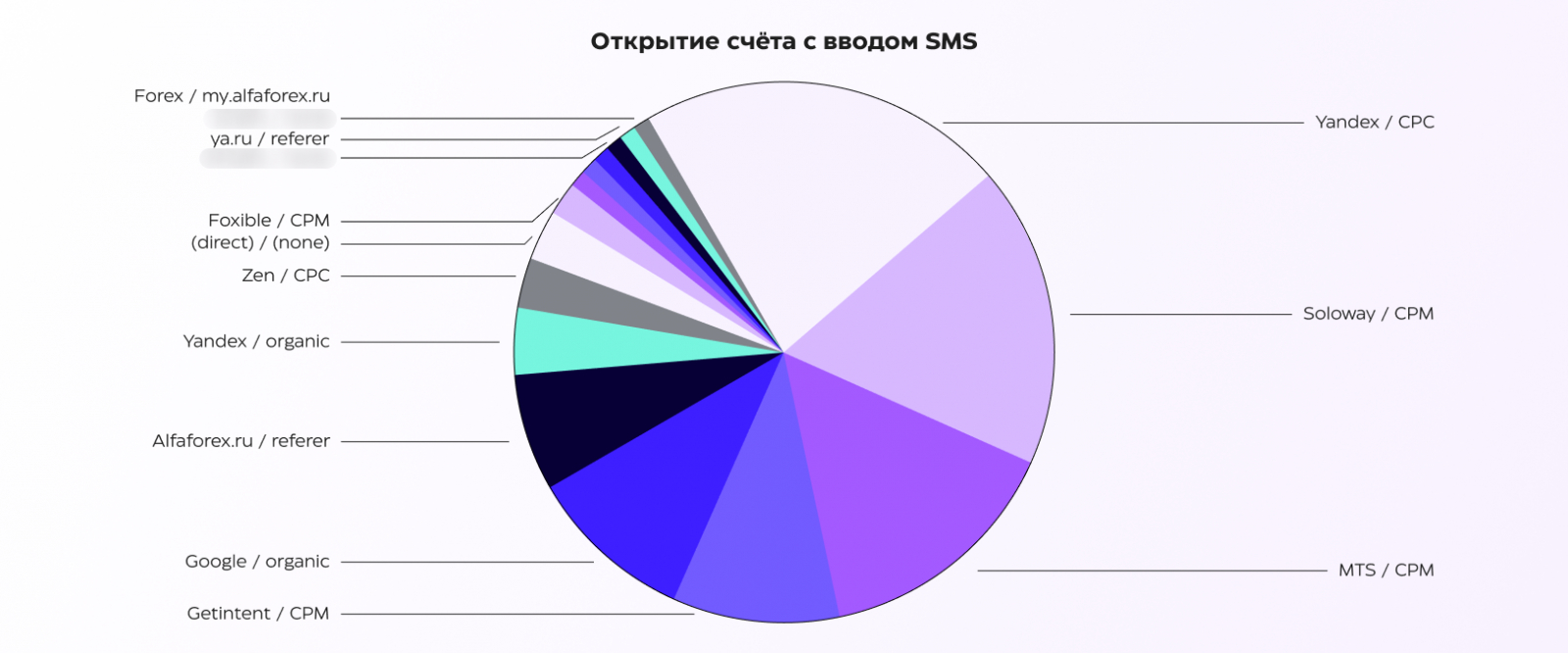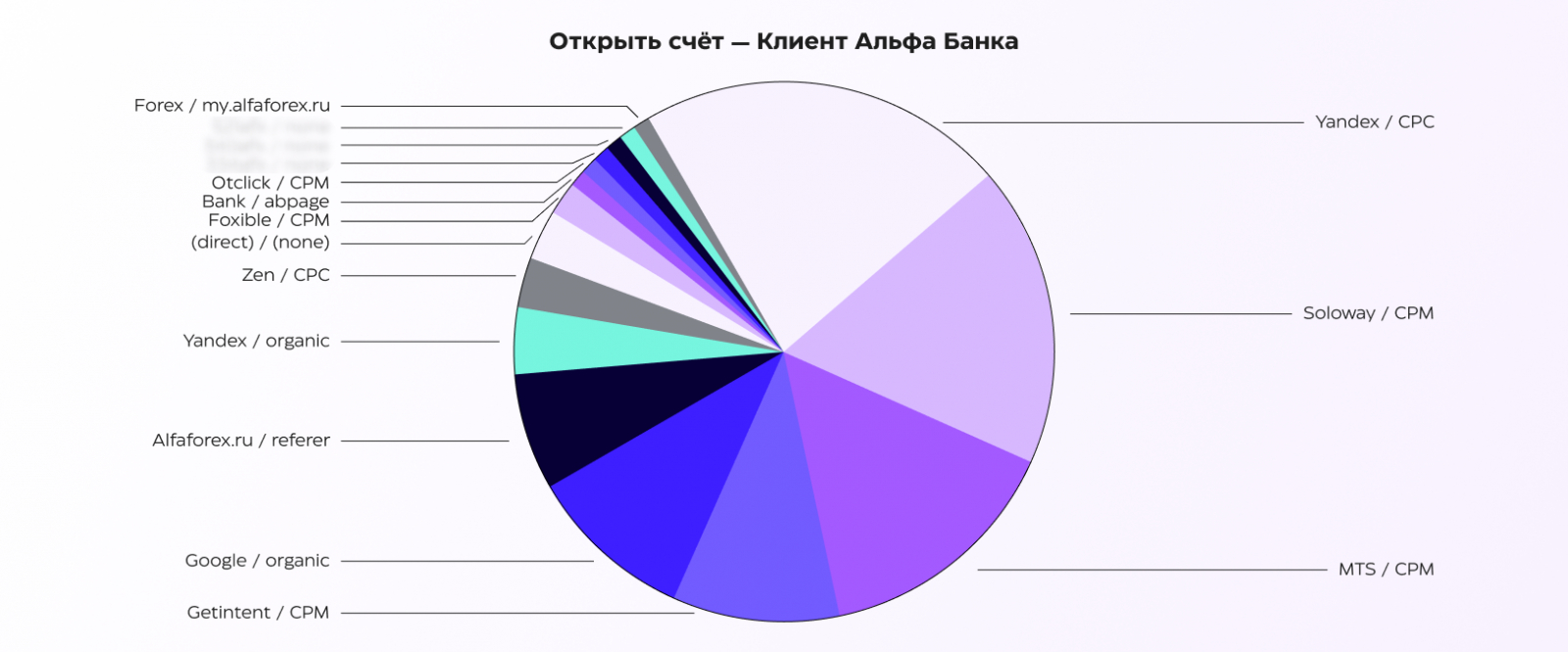 1. Регистрации для клиентов. С контекстной рекламы мы получили подавляющее число регистраций по форме авторизации «Я клиент Альфа Банка». Однако суммарно большая часть пользователей, совершивших конверсию, взаимодействовали с нашими медийными каналами Soloway, MTS, Getintent.