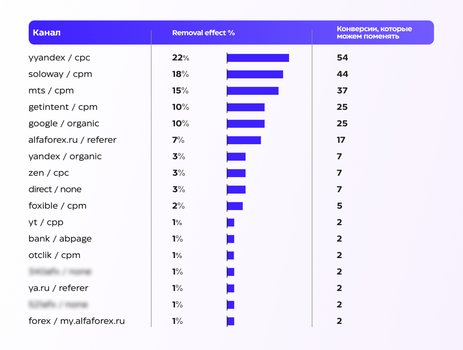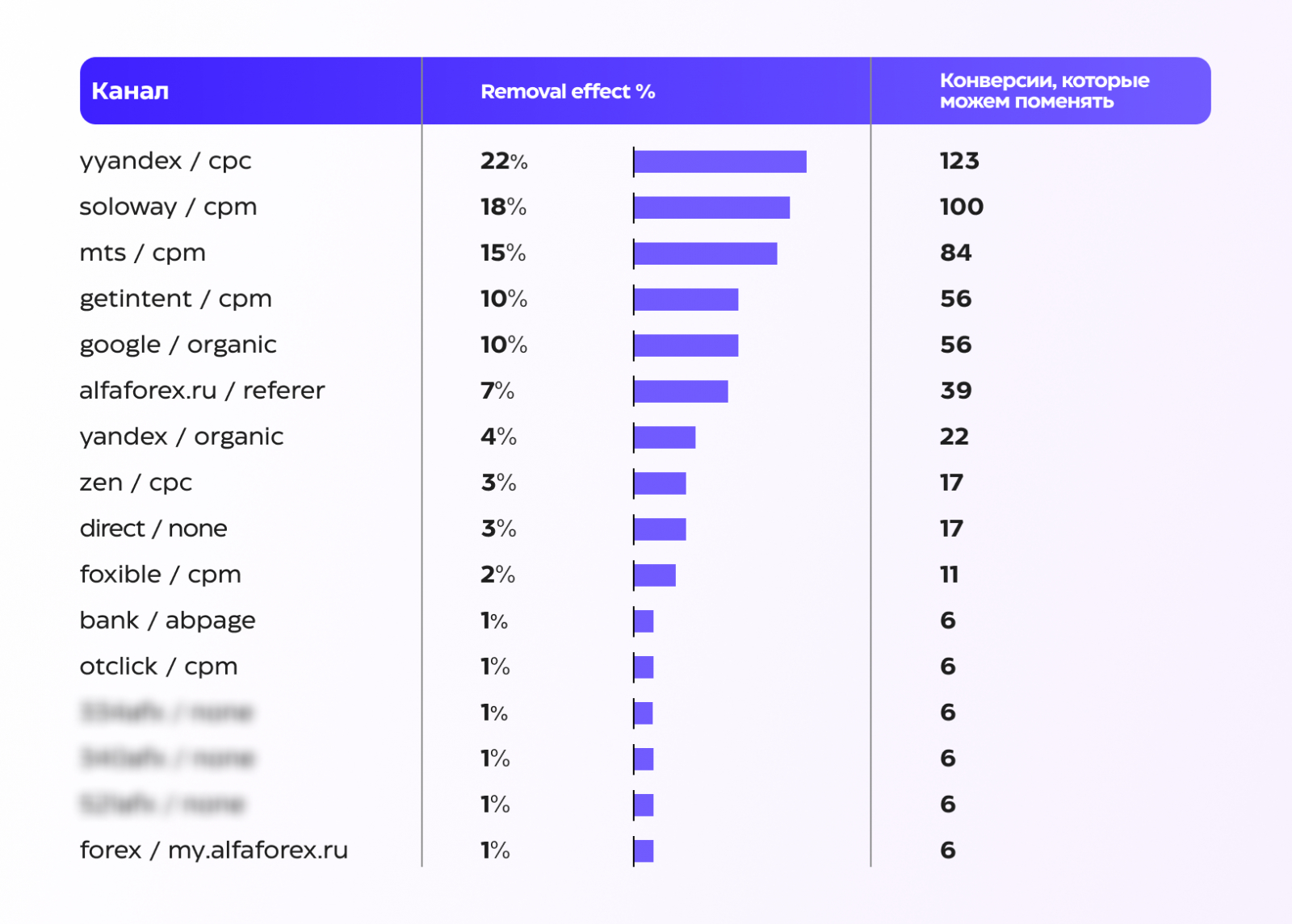 Исследование Removal effect заключается в анализе данных всех касаний пользователя с медийной рекламой бренда до совершения конверсии — формируется путь пользователя, где каждому взаимодействию с рекламой присваивается ценность и определяется % конверсий, которые совершились благодаря участию этого канала в цепочке.