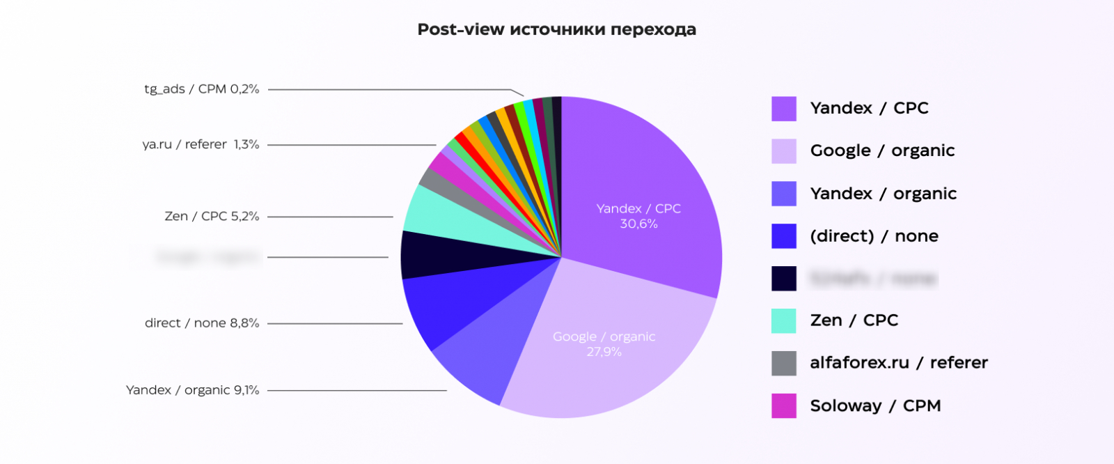 Наибольшее количество Post View переходов пришлось на контекстную рекламу, органические и прямые заходы. При этом важно, что большую часть трафика Post View составила органика, в том числе из Google.