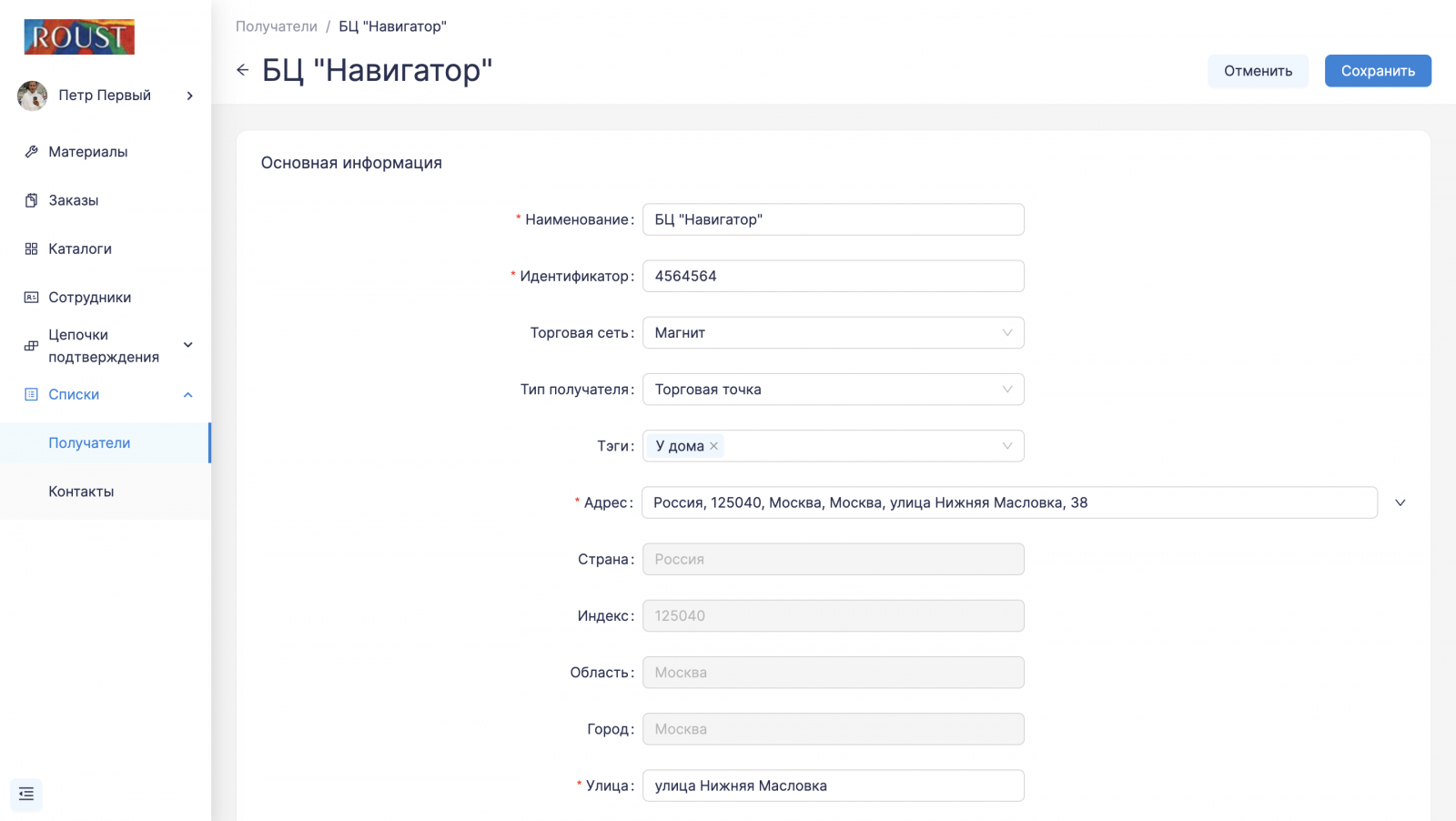 Структурировать работу с заказами в разрезе получателей, торговых сетей, географии позволяет справочник получателей.Карточка получателя содержать информацию о торговой сети, типе получателя, позволяет добавить индивидуальные пользовательские теги.