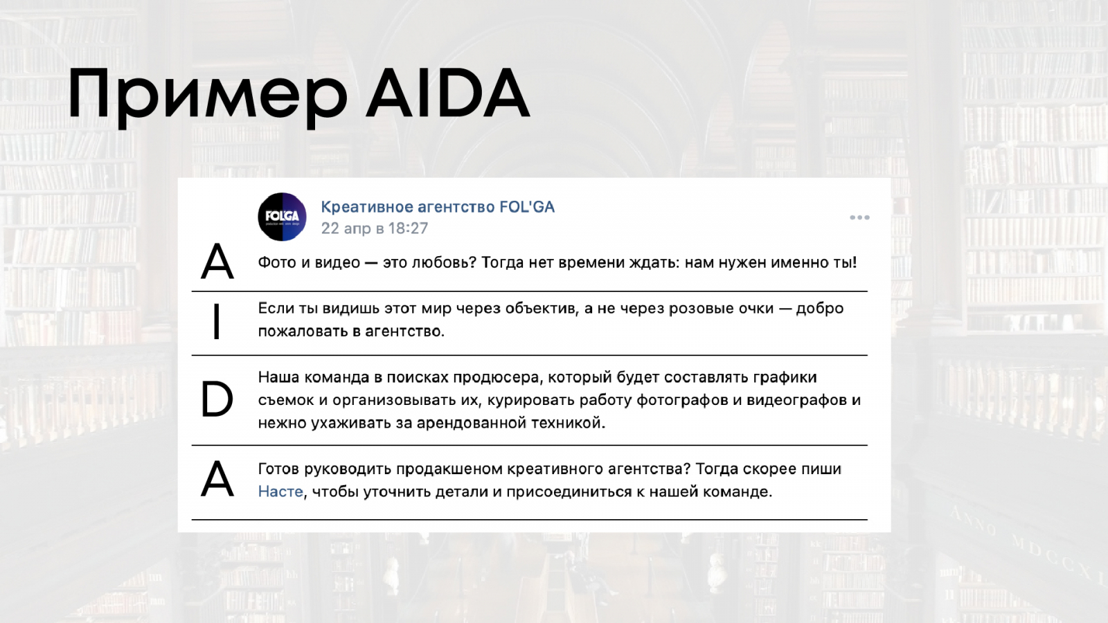 AIDA, или «аида» — модель, по которой потребитель принимает решение о покупке. То есть пост в соцсетях должен строиться по AIDA. A — attention, внимание. I — interest, интерес. D — desire, желание. A — action, действие.