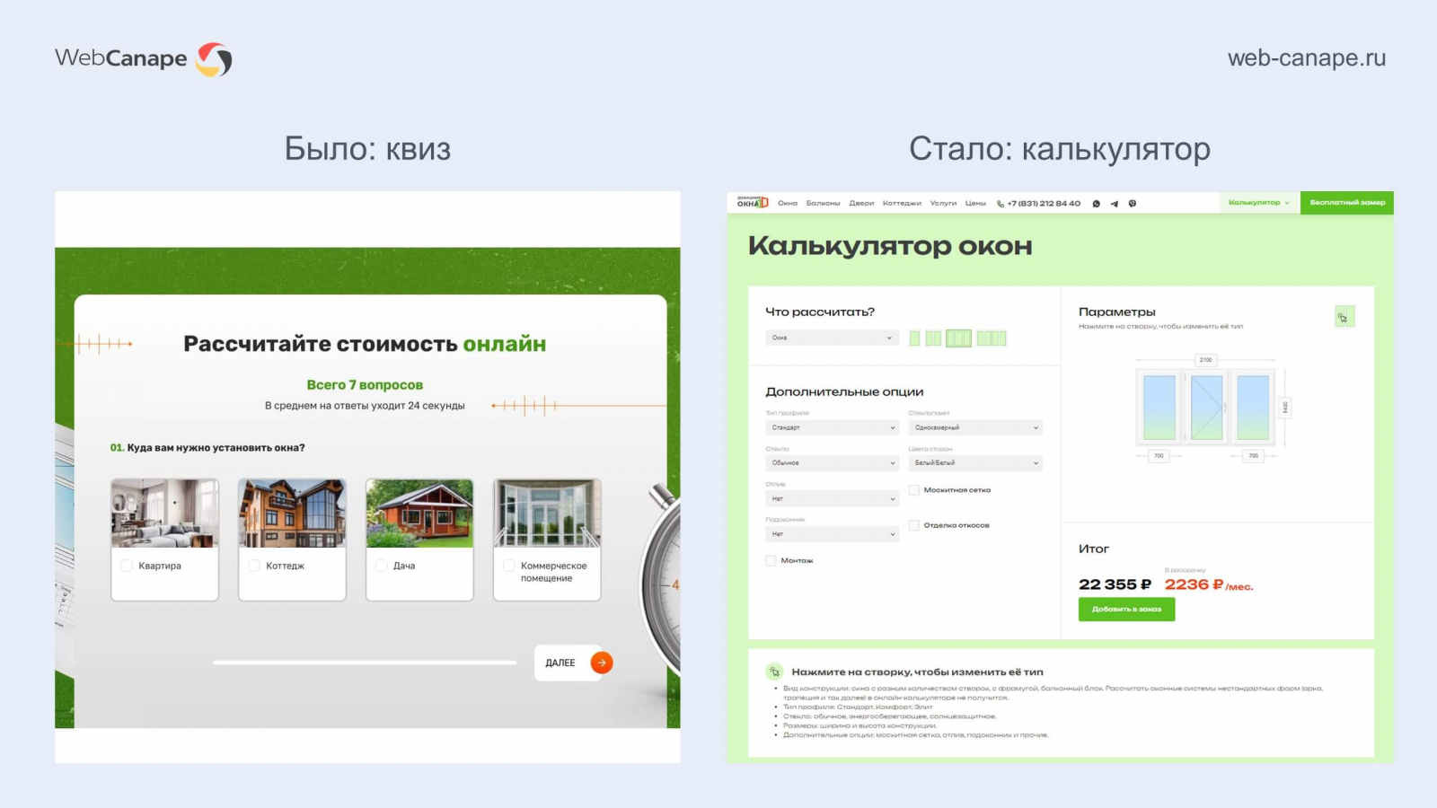 Ранее на сайте не было калькулятора окон. Был квиз, который его имитировал. В ходе реконструкции сайта мы подключили полноценный модуль онлайн-расчета окон.