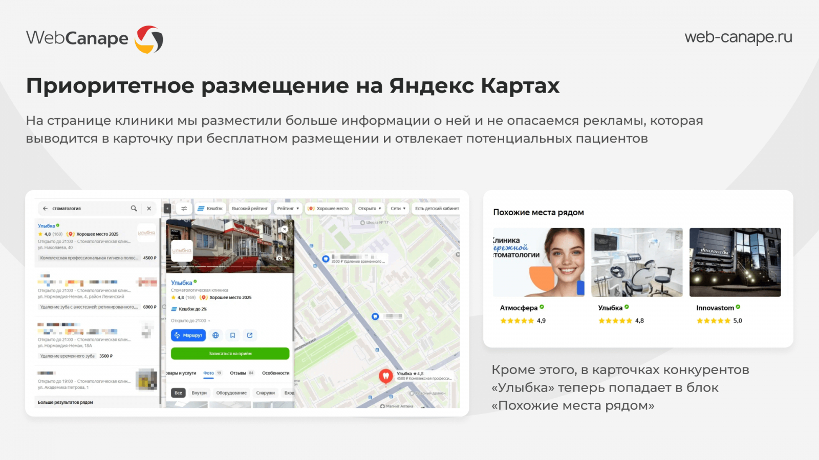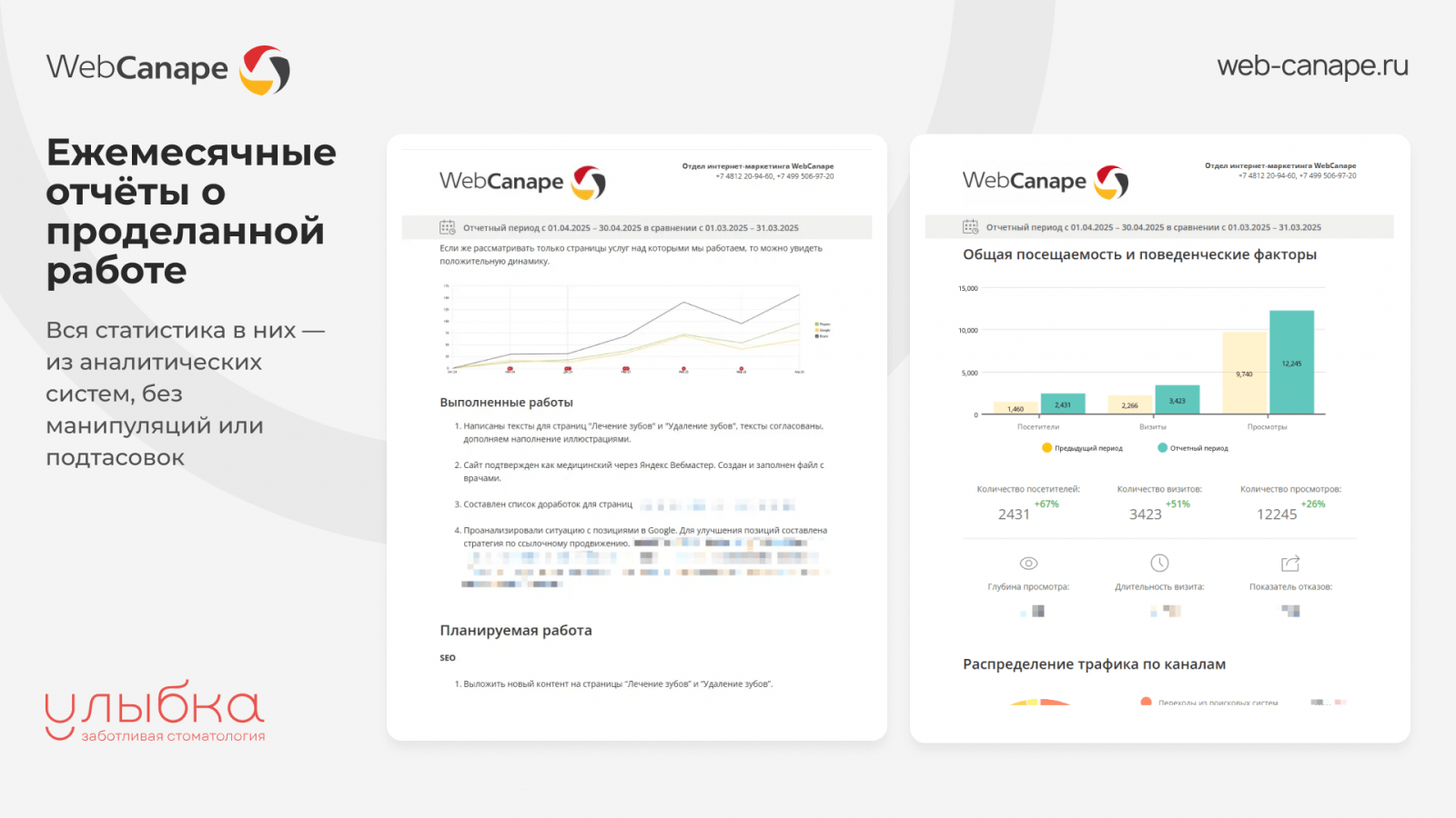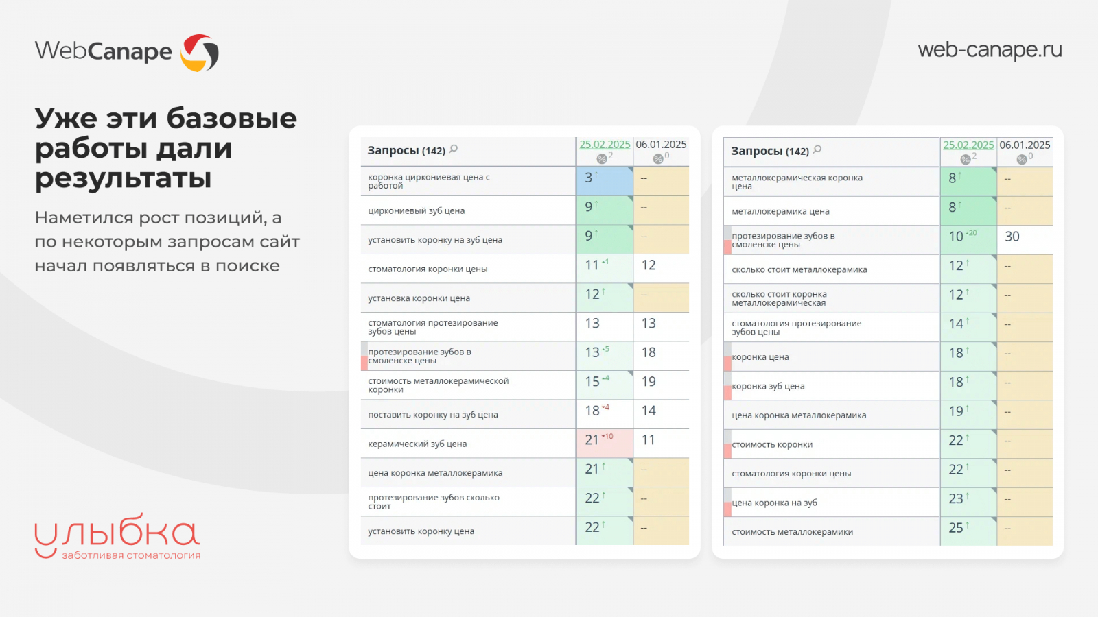Именно в этот момент «Улыбка» пришла к нам в WebCanape. Мы всегда смотрим на проект стратегически: сайт должен выглядеть привлекательно, но главное — приносить заявки. Наша задача — вернуть ему утраченные позиции и обеспечить дополнительный приток пациентов в клинику.
