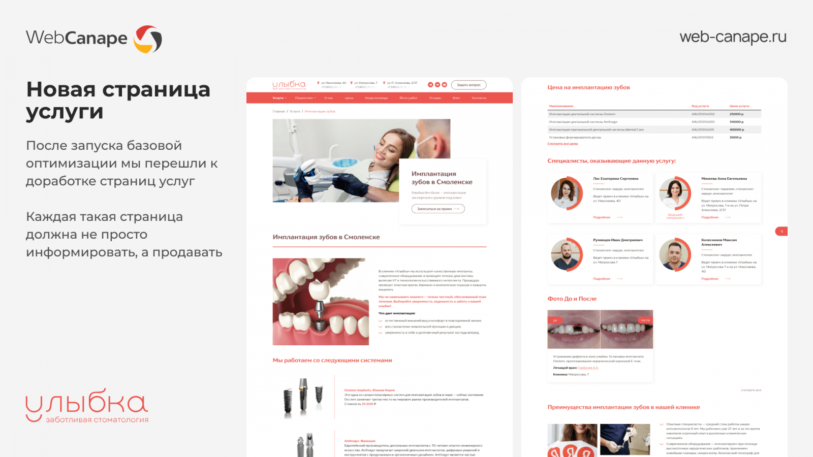 Важно не только рассказать, что вы делаете, но и показать, как, для кого и с каким результатом. Именно так мы дорабатывали страницы «Имплантация», «Протезирование» и другие услуги — с примерами работ, лицами врачей, отзывами и понятным объяснением, зачем эта услуга и кому она подойдет. Такие страницы не просто выходят в ТОП, они приводят заявки.