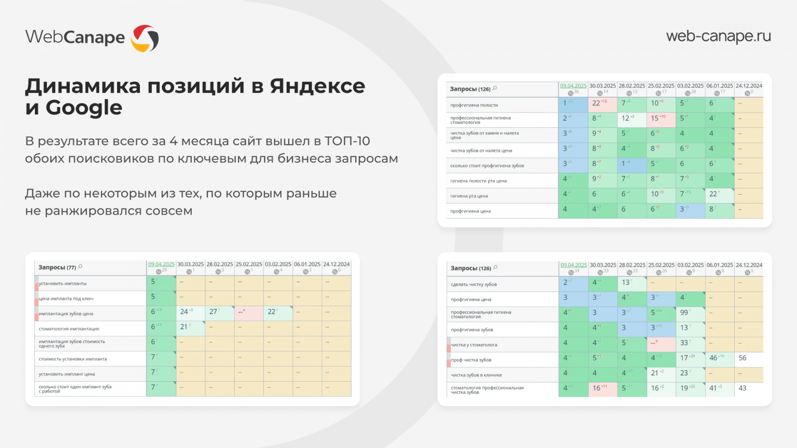 В этом кейсе расскажем, как мы вывели в ТОП сайт стоматологической клиники в Смоленске — без накруток, но с результатом уже через 4 месяца.