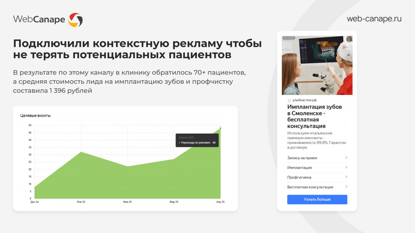 В результате по этому каналу в клинику обратилось 70+ пациентов, а средняя стоимость лида на имплантацию зубов и профчистку составила 1 396 рублей.
