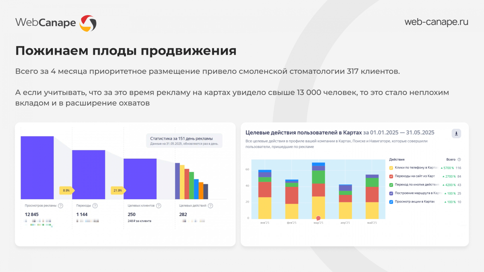 Всего за 4 месяца приоритетное размещение привело смоленской стоматологии 317 клиентов. А если учитывать, что за это время рекламу на картах увидело свыше 13 000 человек, то это стало неплохим вкладом и в расширение охватов.