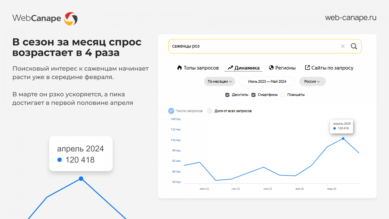 Перед запуском мы оценили сезонный спрос, поведение пользователей и уровень конкуренции. Поисковый интерес к саженцам начинает расти уже в середине февраля. В марте он резко ускоряется, а пика достигает в первой половине апреля. Например, частотность запроса «саженцы роз» в марте превышает февраль почти в 4 раза. При этом конкуренция в выдаче высокая — на рынке работают десятки питомников, в том числе крупные агрегаторы.
