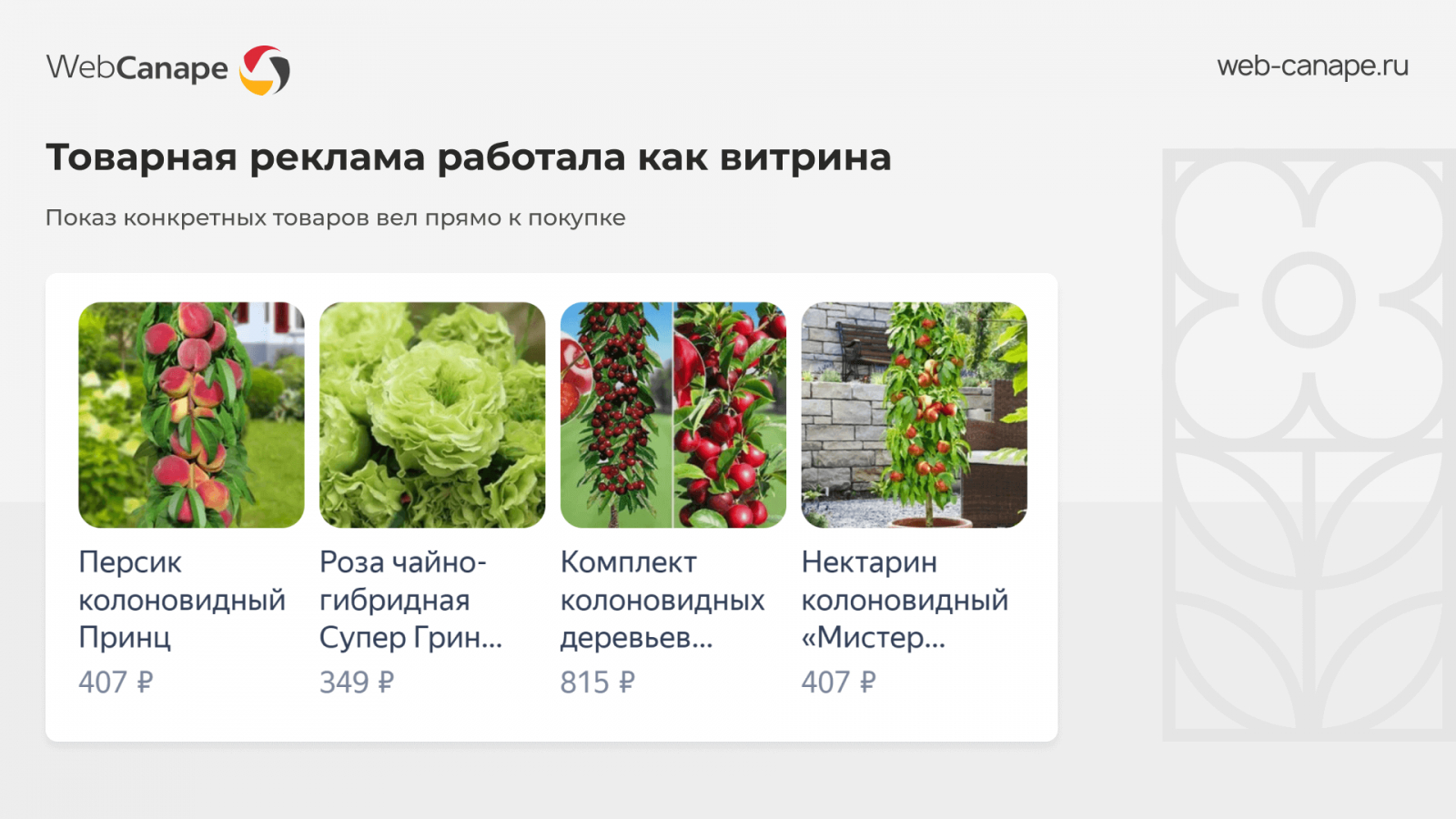 Параллельно мы запустили кампанию в поиске — с фокусом на горячую аудиторию, которая уже ищет конкретные растения для покупки. Это был инструмент точечного захвата спроса и прямых заявок.