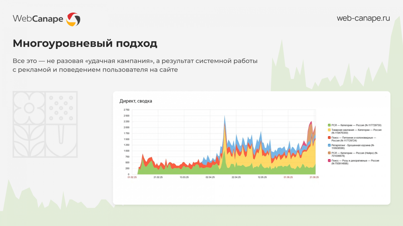 Но весна — не единственный сезон в этой нише. Уже в мае мы начали готовить рекламную систему к новым задачам: вместе с клиентом развиваем ассортимент, расширяем категории, тестируем новые подходы, готовим рекламные кампании. И, конечно, адаптируем стратегию: