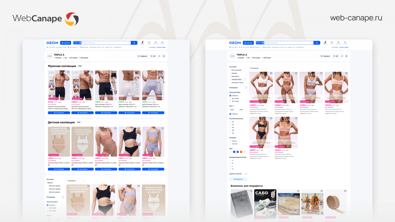 В случае с брендом «Triple A» в рамках комплексной оценки мы изучили конкурентов в нужной категории, сравнили ценовые сегменты, проанализировали структуру спроса и расходы на внутреннее продвижение. Отдельно посмотрели, как работает премиум-сегмент на разных площадках и как себя чувствуют в нем новые бренды. Стало понятно: на Ozon ниша шире и аудитория более склонна к покупке дорогого белья.