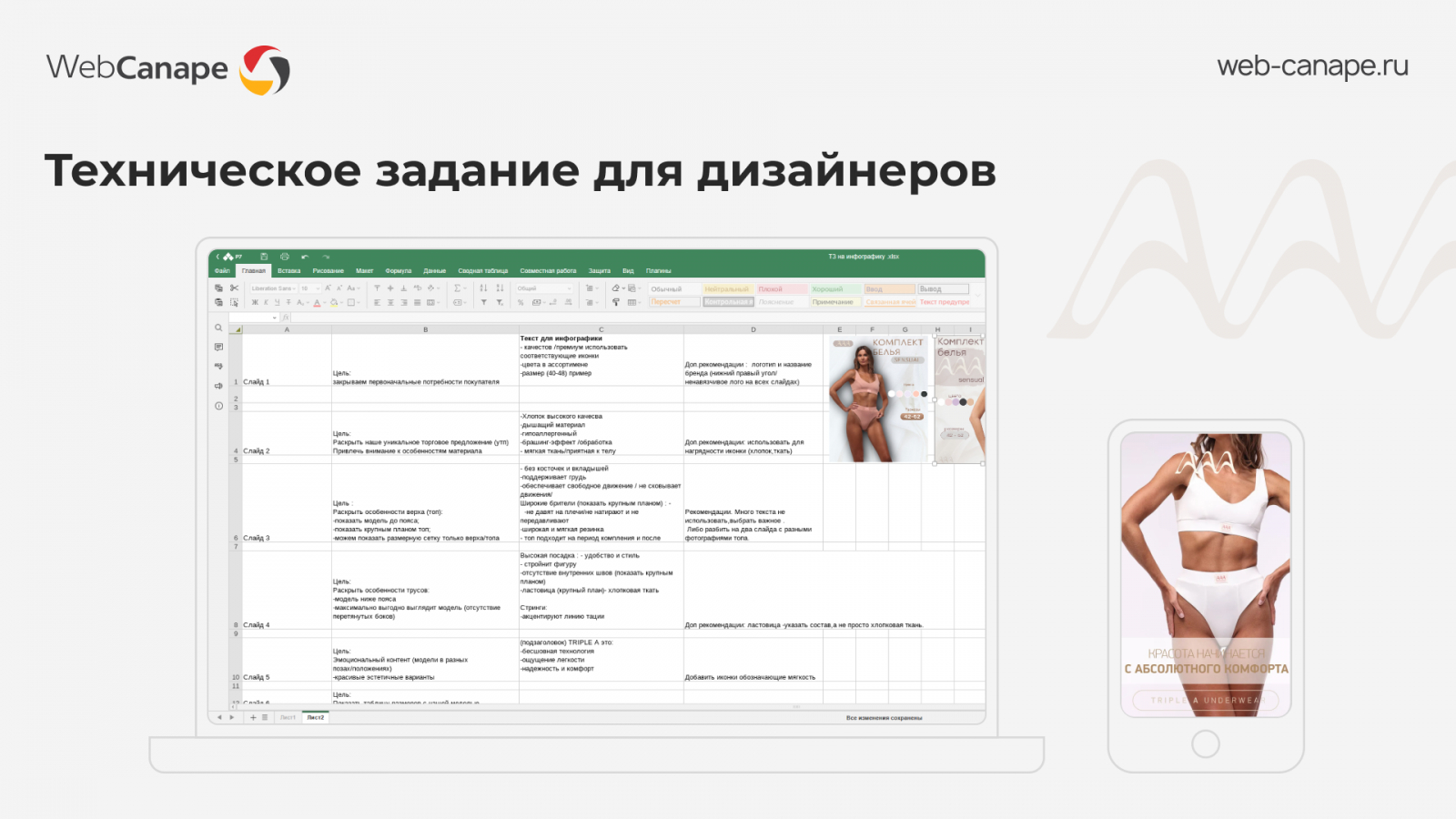 При создании технического задания на инфографику мы опирались не только на свой опыт в fashion-сегменте, но и привлекли нейросеть. Проанализировали выдачу Ozon в категории, собрали референсы конкурентов и с помощью ChatGPT получили несколько идей, как нам отстроиться и выделиться на их фоне. Сгенерированное техническое задание специалисты отдела продвижения на маркетплейсах наполнили конкретикой, экспертным пониманием особенностей ниши и поведенческих факторов.