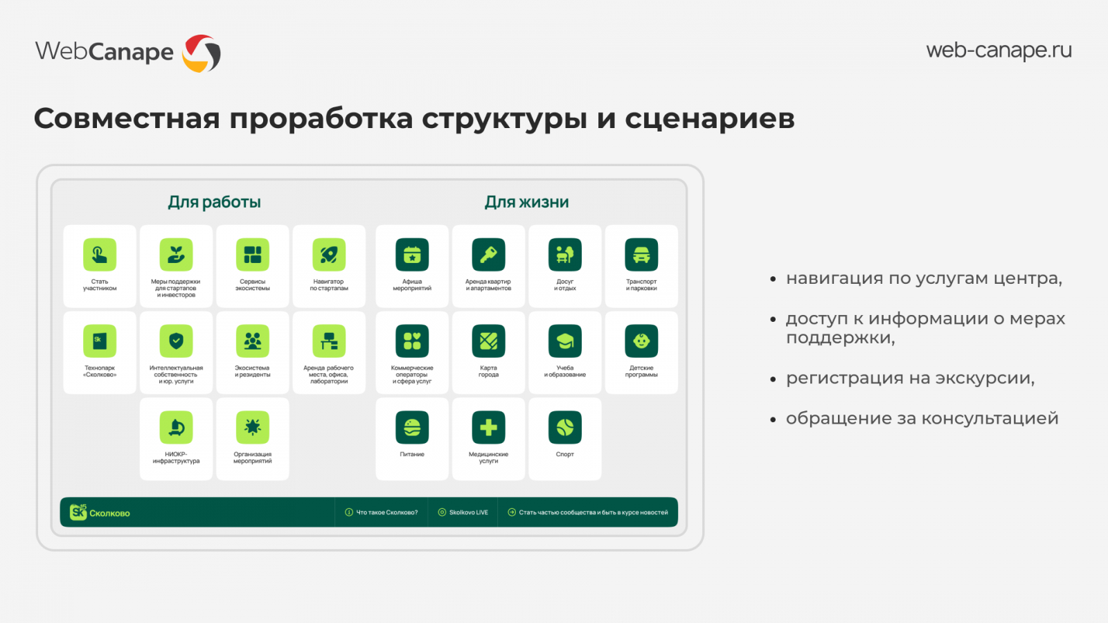 Проект мы начали с самого важного — понимания, зачем человек подойдет к панели и что он ожидает увидеть на экране. Вместе с командой «Сколково» мы выделили четыре ключевые задачи, которые интерфейс должен решать без лишних действий: