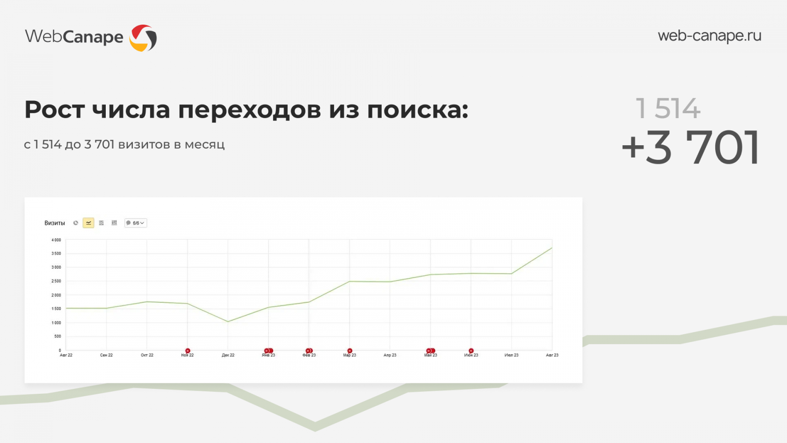 В результате за год мы почти в 2,5 раза увеличили количество переходов из поиска — с 1 514 до 3 701 визитов ежемесячно.