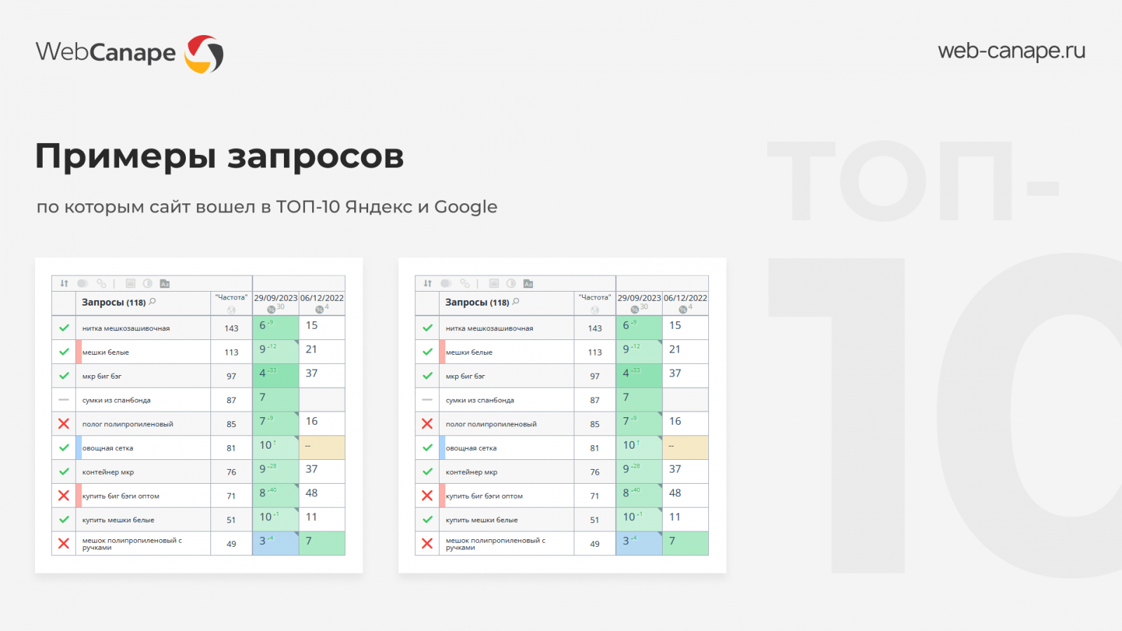 А по многим ключевым для бизнеса поисковым запросам, например, «мешки полипропиленовые оптом», «купить сетку для овощей оптом» или «сетка под овощи» сайт вышел в ТОП-10 Google и Яндекса по всей России.