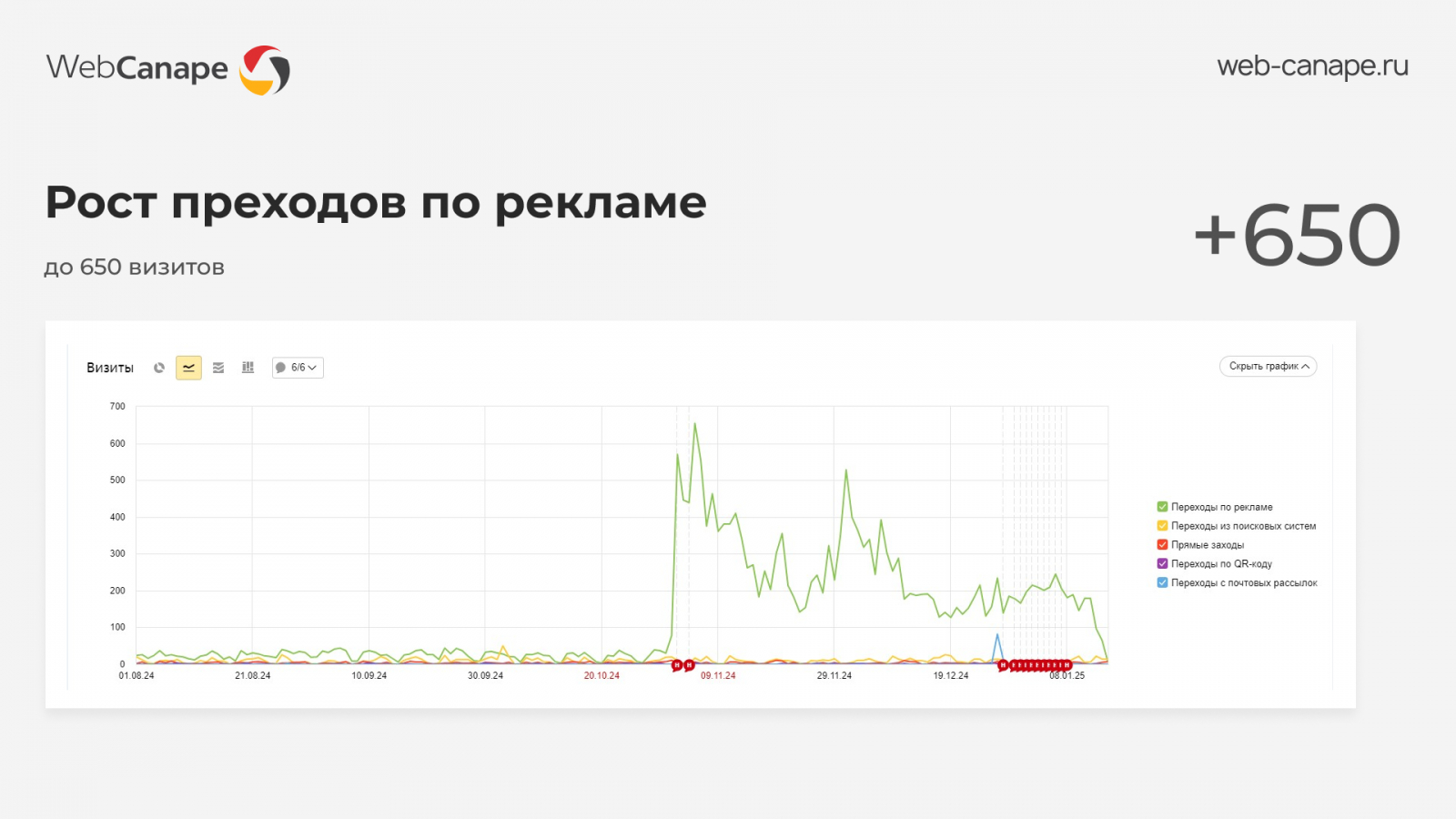 Переходы по рекламе взлетели до 650 визитов, и это в разы превышало суммарный трафик со всех каналов на сайт клиента.