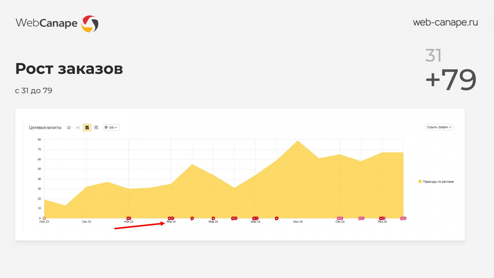 Результат не заставил себя ждать. По мере обучения кампании уже в феврале заказы выросли с 31 до 55, а в июле клиенты сделали уже 79 покупок. С учетом того, что кампании были запущены только на категории товаров с высоким средним чеком, реклама стабильно окупалась. Таким образом, после старта ЕПК мы добились более чем 60% роста целевых обращений.